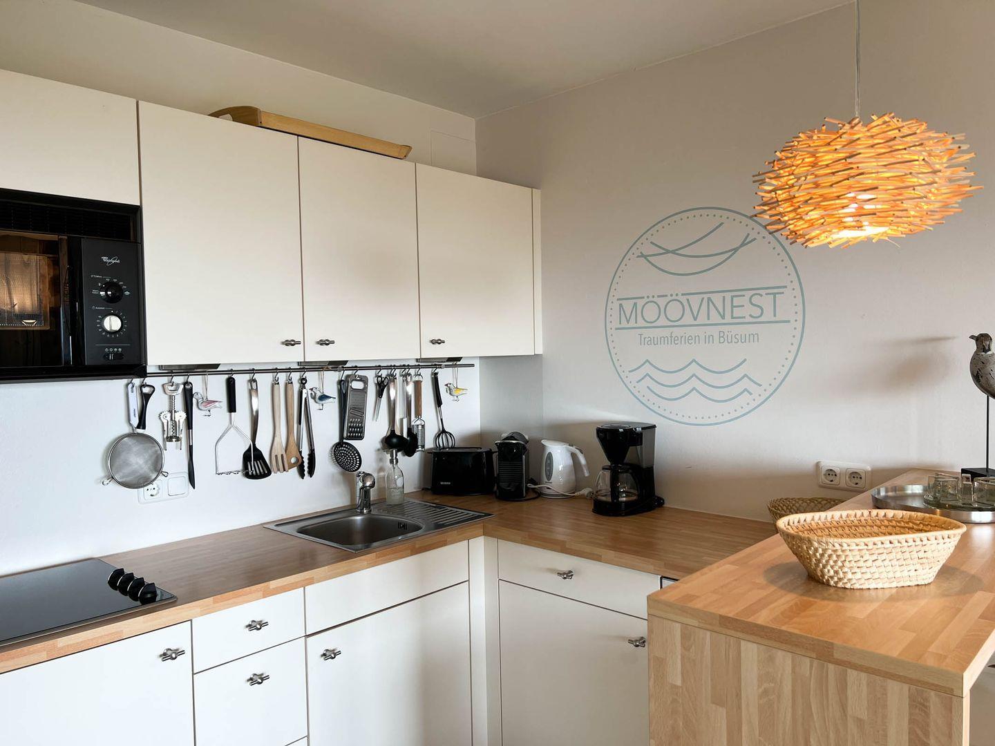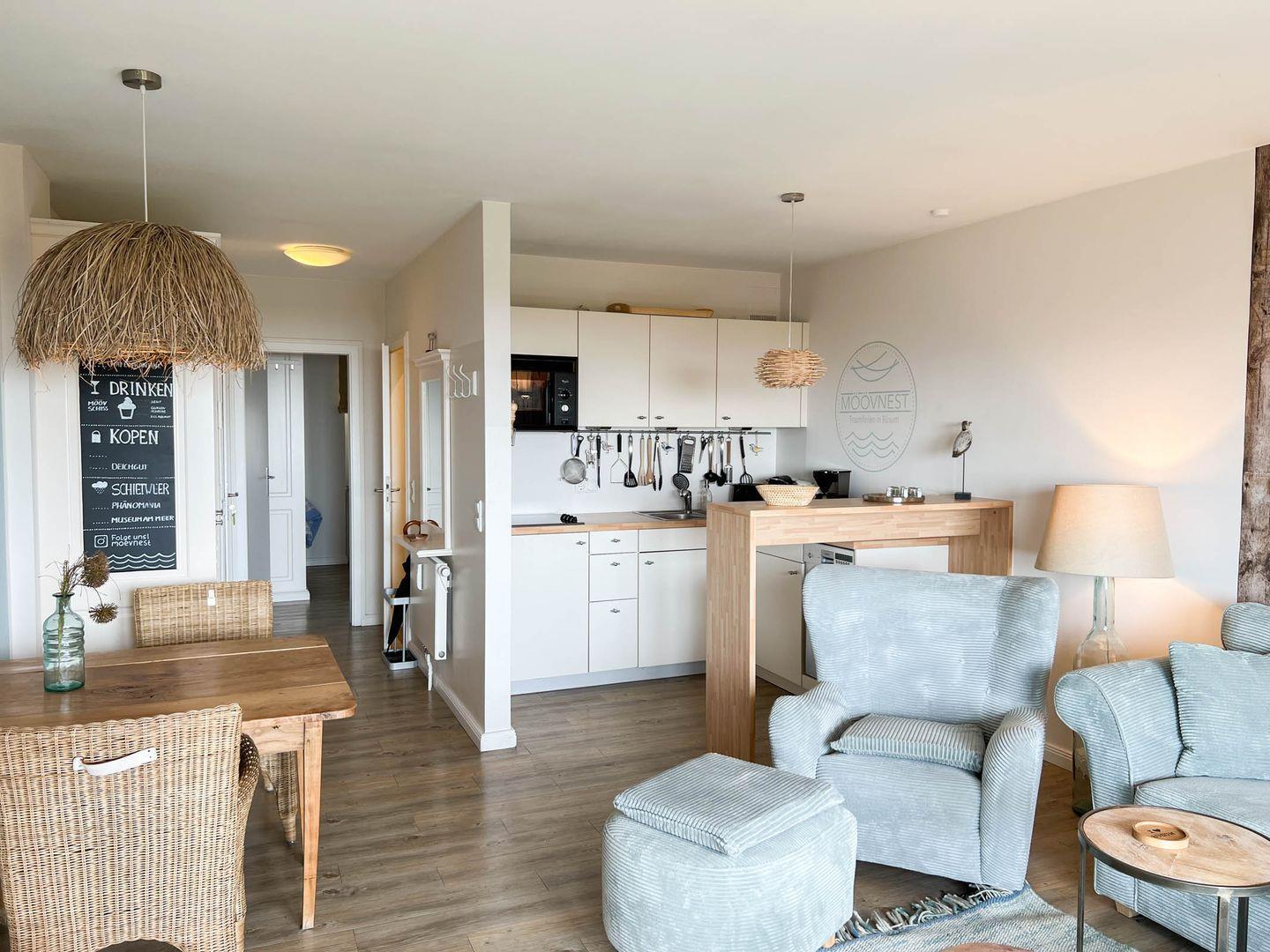 Die zum Wohnraum hin offene Küche ist mit Mikrowelle, Cerankochfeld, Geschirrspüler und Espressomaschine gut bestückt. Die hier zubereiteten Köstlichkeiten können gemütlich im Essbereich oder stimmungsvoll bei Sonnenuntergang auf dem Balkon genossen werden.
