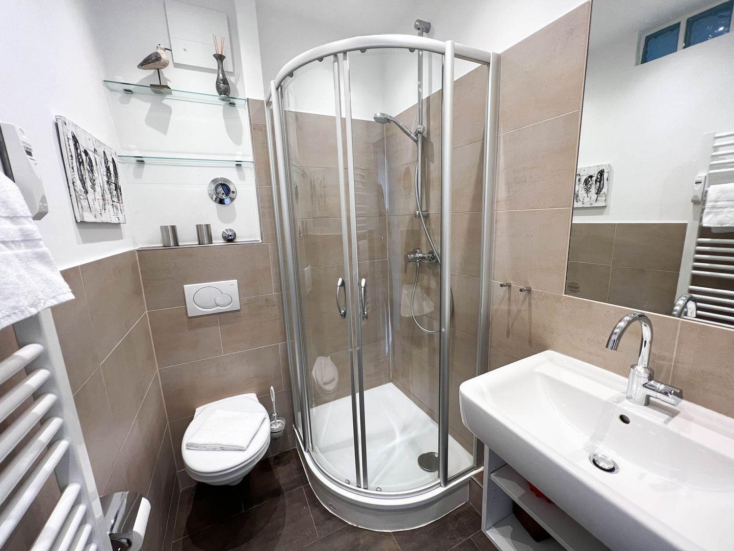 Das Badezimmer ist mit einer Dusche sowie Extras wie Handtuchheizung, Haar-Föhn, Kosmetikspiegel modern ausgestattet.