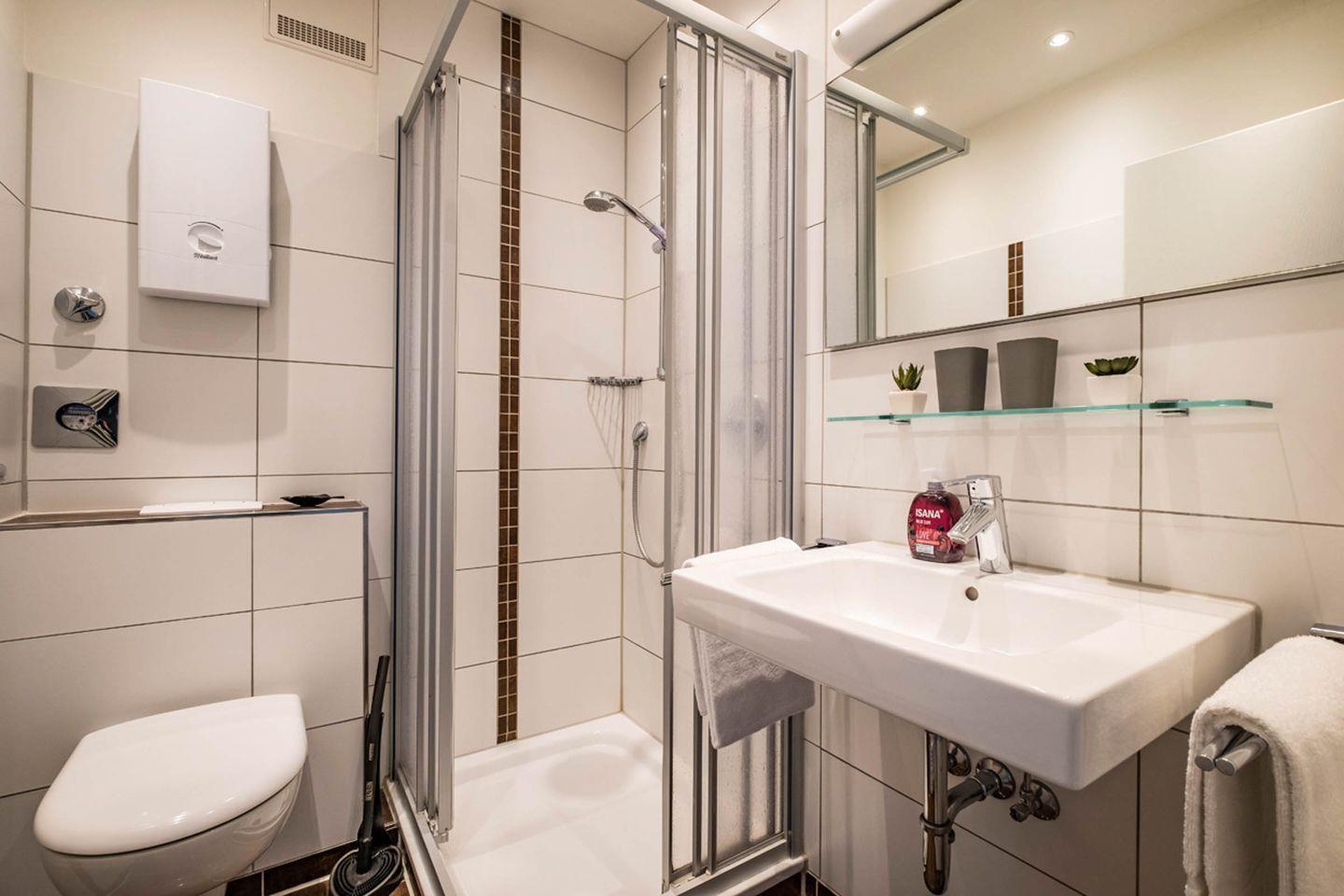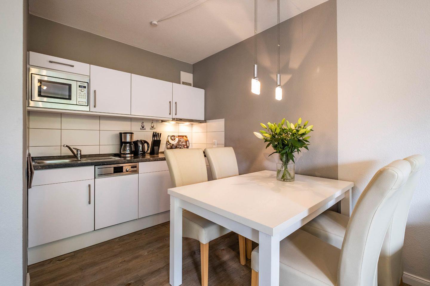 Die Küche und der Essbereich sind im Wohnbereich integriert. Das Schlafzimmer ist mit einem Doppelbett und TV ausgestattet. Das Bad verfügt über eine Dusche/WC. Vom Wohnzimmer aus gelangt man auf die in Südwestlage liegende Terrasse mit Markise. Im Keller befinden sich eine Waschmaschine und ein Trockner (gebührenpflichtig) sowie ein Abstellraum für Fahrräder. Fährräder können auch vor dem Haus im Fahrradständer abgestellt werden. Das Haus verfügt über einen Aufzug.