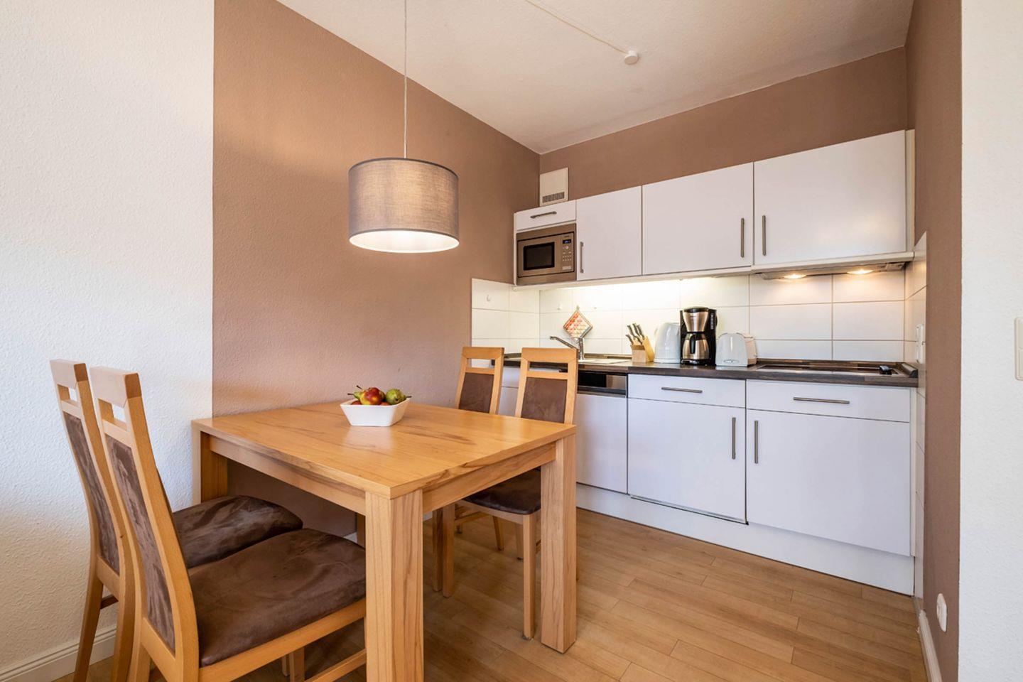 Die Küche und der Essbereich sind im Wohnbereich integriert. Das Schlafzimmer ist mit einem Doppelbett und TV ausgestattet. Das Bad verfügt über eine Dusche/WC. Vom Wohnzimmer aus gelangt man auf die in Südwestlage liegende Terrasse. Im Keller befinden sich eine Waschmaschine und ein Trockner (gebührenpflichtig) sowie ein Abstellraum für Fahrräder. Fährräder können auch vor dem Haus im Fahrradständer abgestellt werden. Das Haus verfügt über einen Aufzug.