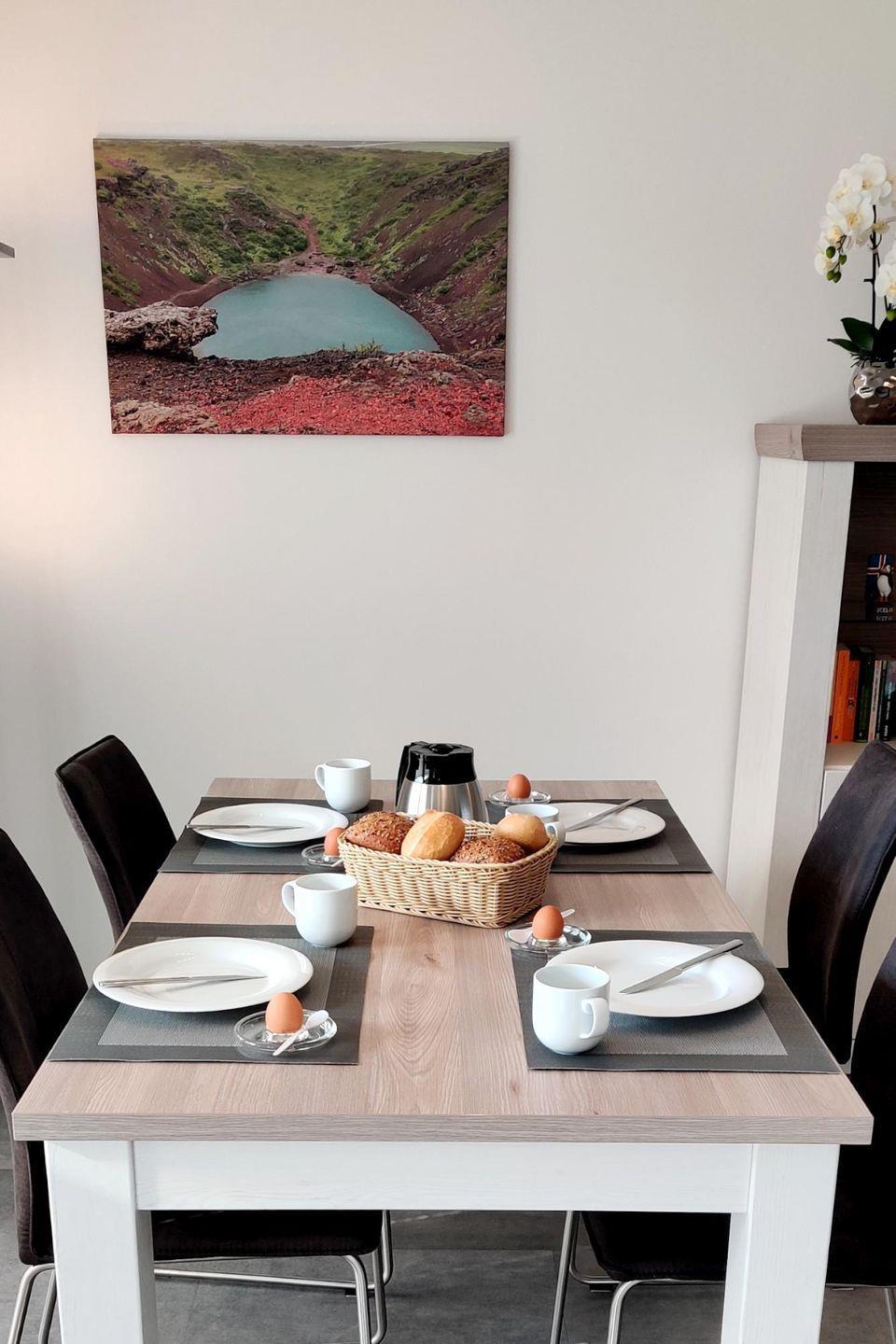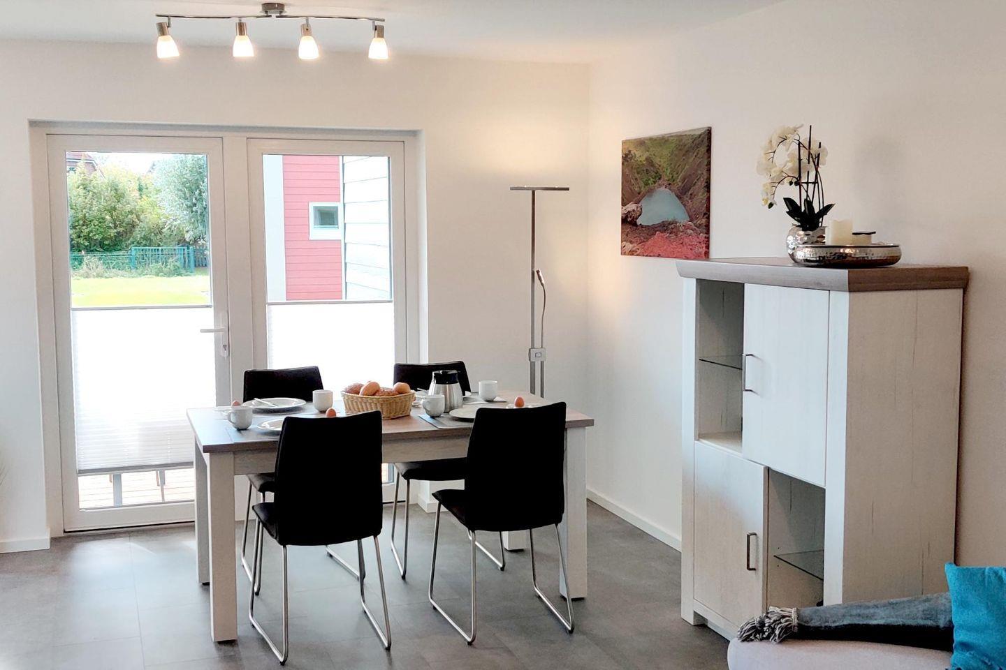 Der lichtdurchflutete Wohn- und Essbereich lädt mit seinem gemütlichen großen Ecksofa und dem Kaminofen zum Lesen und Fernsehen ein, der große Esstisch zum gemeinsamen Essen und spielen. Eine Spielesammlung ist vorhanden. Angrenzend an den Wohn- und Essbereich liegt die offene Küche, die hochwertig mit Geschirr, Töpfen, Pfannen und Kochutensilien ausgestattet ist sowie einen Kühlschrank mit Gefrierfach, ein Geschirrspüler und eine Waschmaschine enthält. Ihren Kaffee können Sie sich mit der Filterkaffee- oder der Senseo-Kaffeepadmaschine zubereiten. Von der Küche und dem Essbereich aus gelangen Sie auf die Südterrasse, ausgestattet mit einem Gartentisch und -Stühlen und direktem Zugang zum Garten.