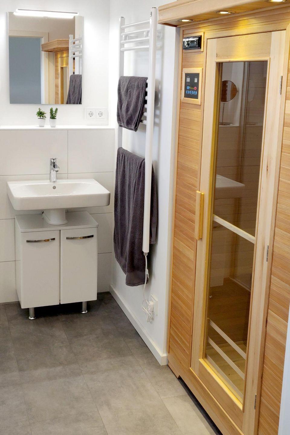 Das Badezimmer verfügt über eine große ebenerdige Dusche, ausreichend Ablagefläche und einer Handtuchheizung sowie einer Toilette. Für Wellness-Feeling sorgt eine Infrarotkabine mit entspannender Wärme.