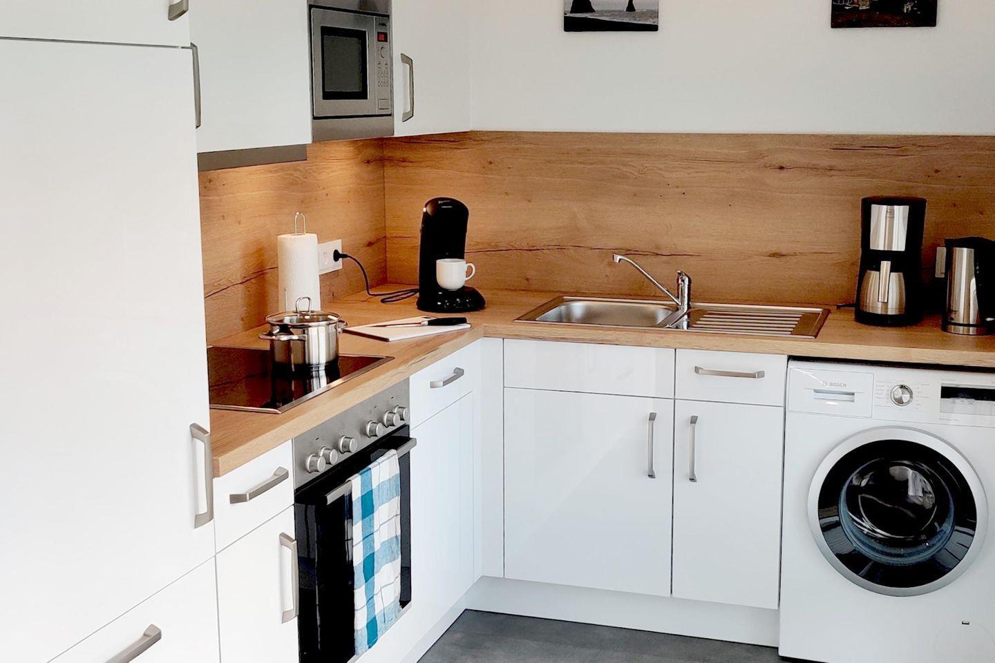 Küche: Cerankochfeld, Kühlschrank mit Gefrierfach, Backofen, Geschirrspüler, Mikrowelle, Wasserkocher, Toaster, Filterkaffee-Maschine, Senseo-Kaffeepadmaschine, Waschmaschine