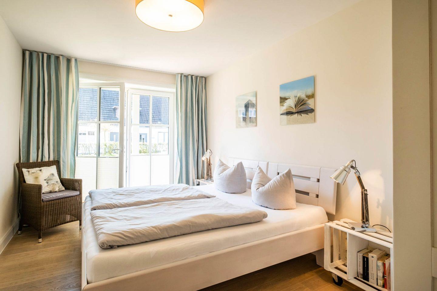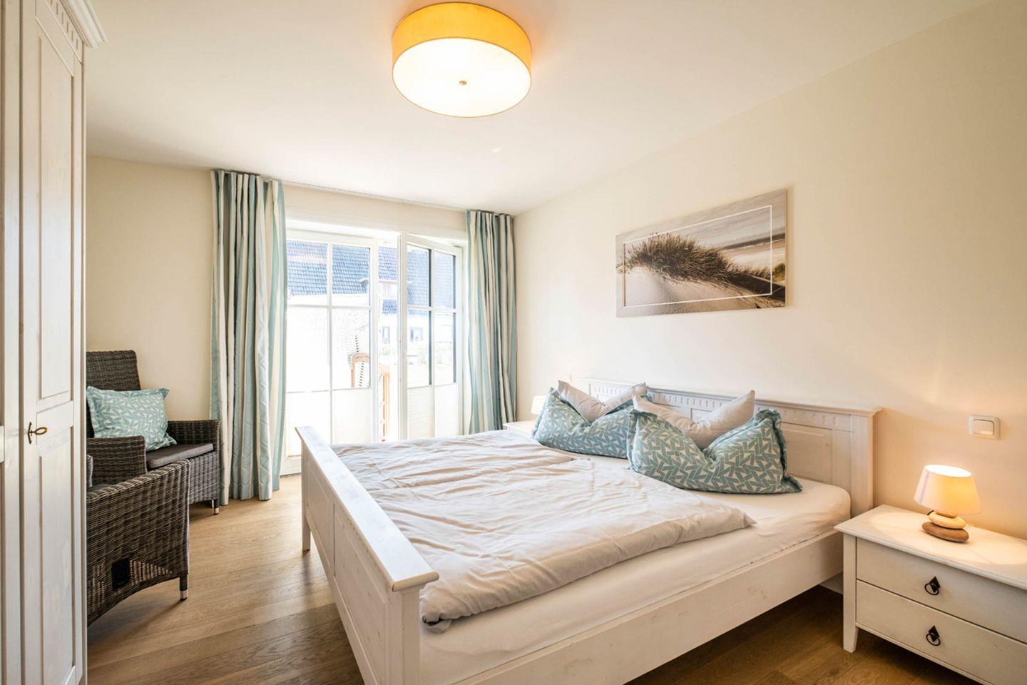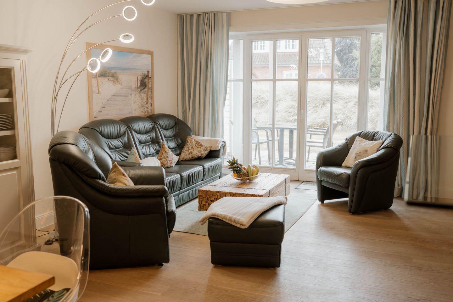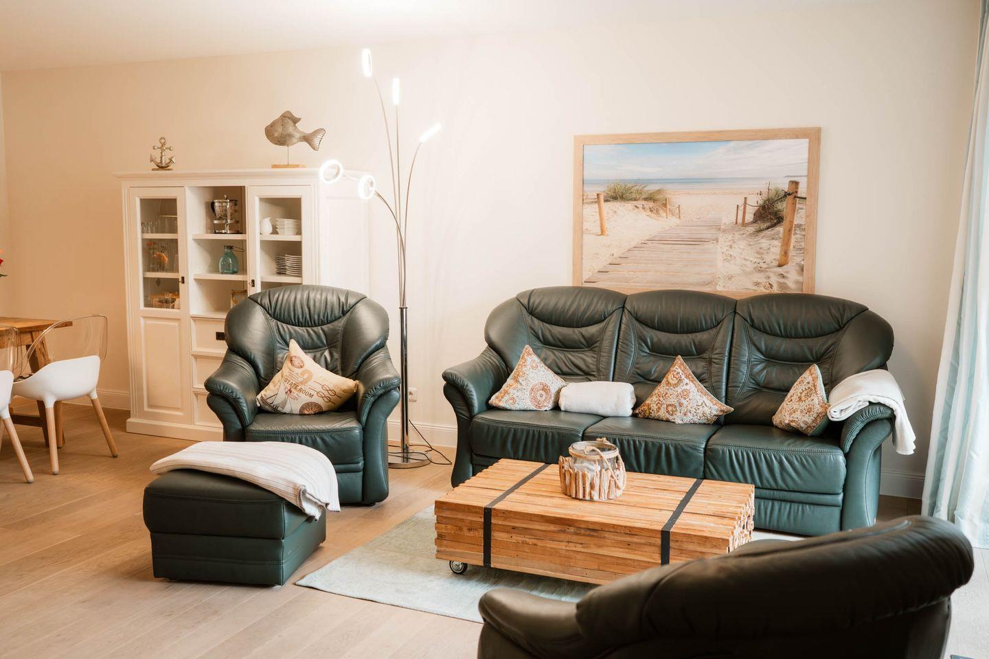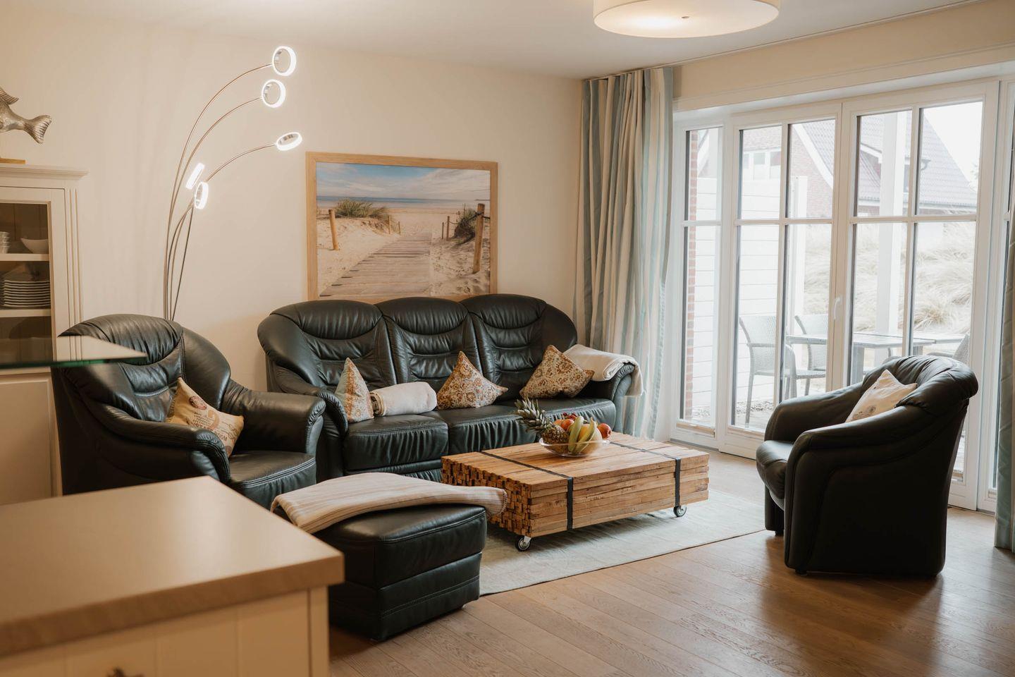 Das Appartement 1.1 befindet sich im Erdgeschoss mit Terrasse. Im Wohnraum finden Sie eine gemütliche Couchgarnitur, Sessel mit Hocker und einen Relax-Sessel. Die Küche und der Essbereich sind im Wohnbereich integriert. Beide Schlafzimmer sind mit Doppelbetten in Komforthöhe ausgestattet. Ein Schlafzimmer mit TV. Das Bad verfügt über eine barrierefreie Dusche, WC und Sauna. Das Appartement verfügt zusätzlich über ein Gäste- WC und einer Abstellkammer. Fußbodenheizung befindet sich im ganzen Appartement. Auf die Terrasse gelangen Sie vom Wohnraum und den Schafzimmern, die in Südlage liegt. Das Appartement verfügt über eine Gegensprechanlage mit Kamera. Im Keller finden Sie Waschmaschine und Trockner (gebührenpflichtig), Abstellraum für Fahrräder und einen gemeinschaftlichen Fitnessraum. Aufzug im Haus. Am Haus finden Sie einen weiteren abschließbaren Fahrradabstellraum und einen kleinen Spielplatz für unsere kleinen Gäste.