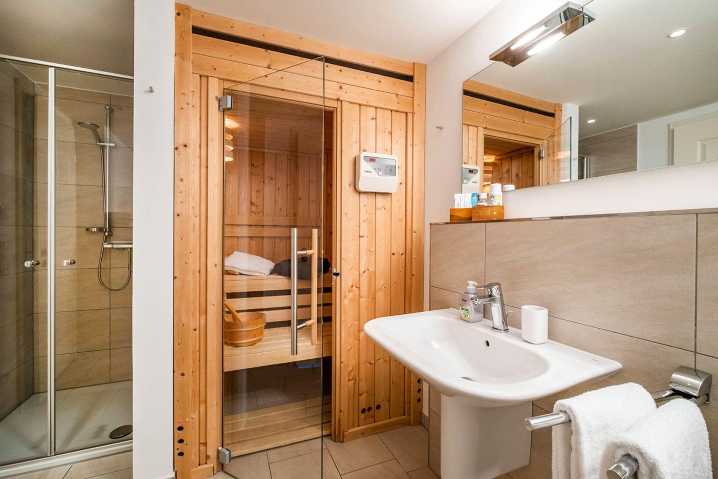Sanitär: Duschbad, Sauna, Gäste-WC, Föhn