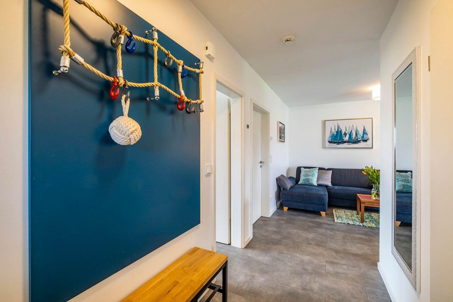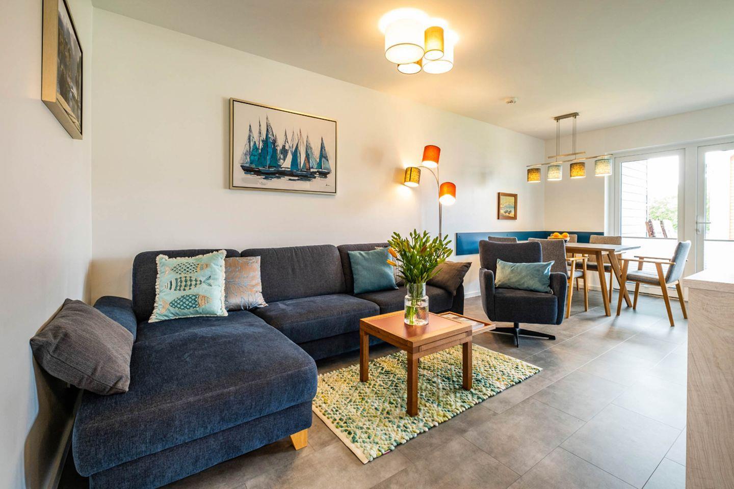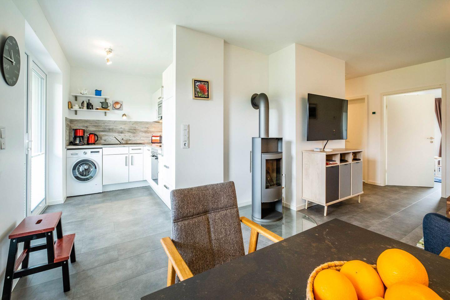 Die moderne, liebevoll eingerichtete Wohnung verfügt über einen lichtdurchfluteten Wohn- und Essbereich sowie eine voll ausgestattete Küche mit Waschmaschine. Der Wohnbereich lädt mit einer bequemen Sitzecke, einem Kamin sowie einem großen Smart-TV (Magenta-TV) zum Entspannen ein.