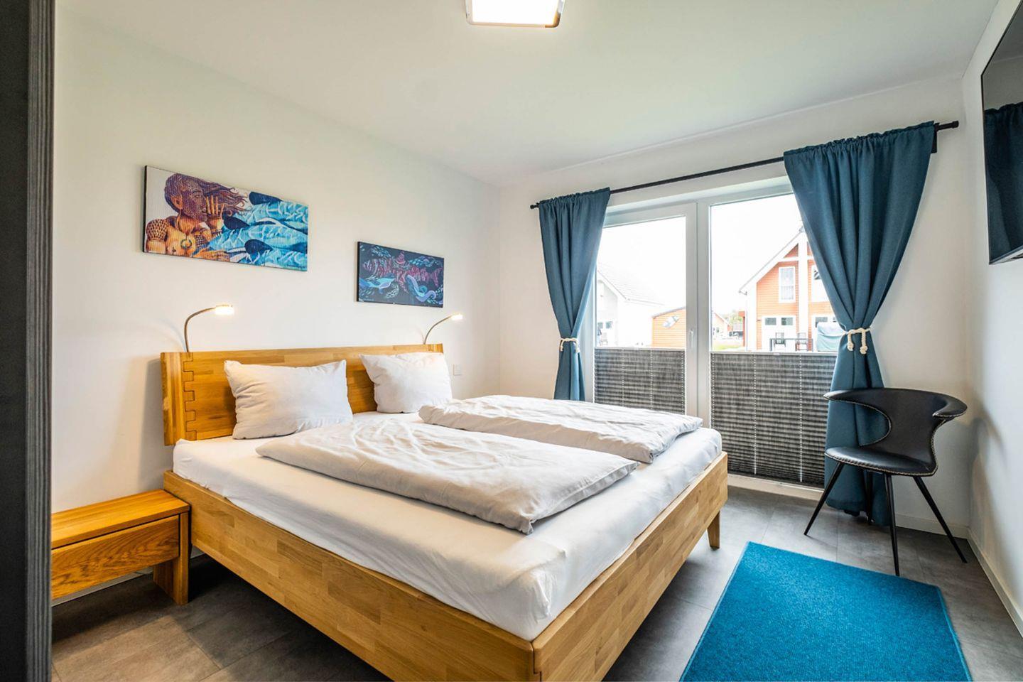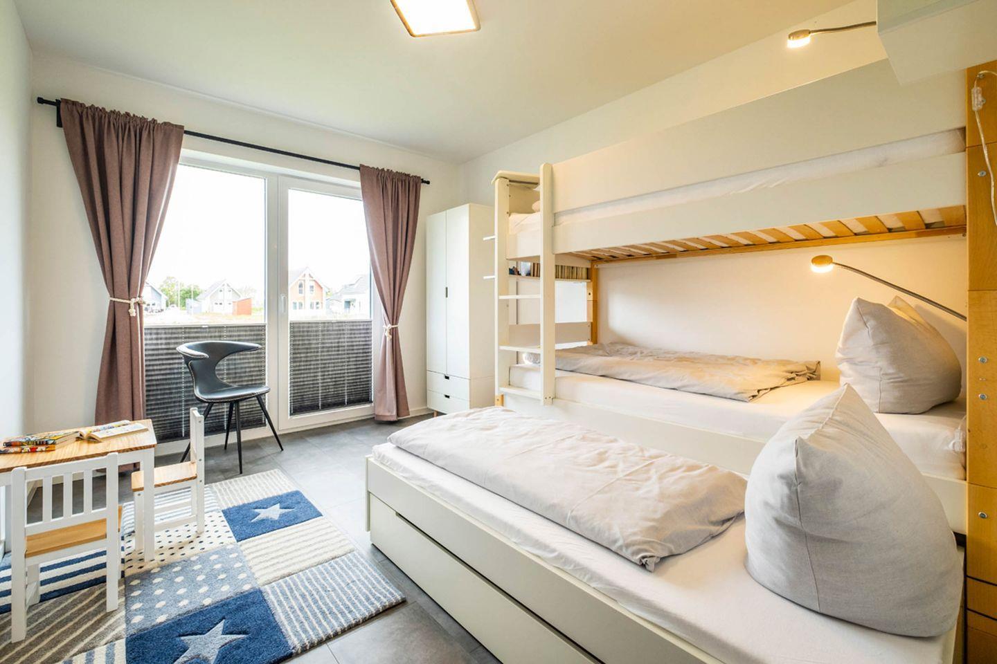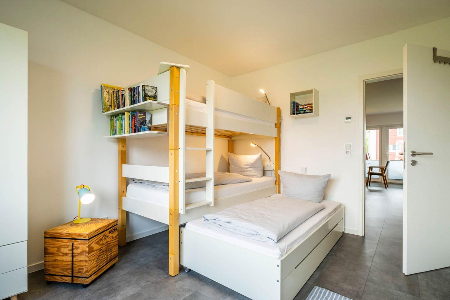 Zur Wohnung gehören zwei Schlafzimmer. Ein Zimmer ist mit einem Doppelbett und einem Fernseher, das zweite mit einem Etagenbett ausgestattet. Letzteres hat bei Bedarf eine Bettschublade für einen fünften Übernachtungsgast (ideal für Familien mit 1-3 Kindern). Für kleinere Kinder kann diese Schublade als Fallschutz genutzt werden. Für Kinder und alle jung gebliebenen liegen Gesellschaftsspiele, Bücher, Puzzle und eine Kiste mit Kapla-Steinen bereit.