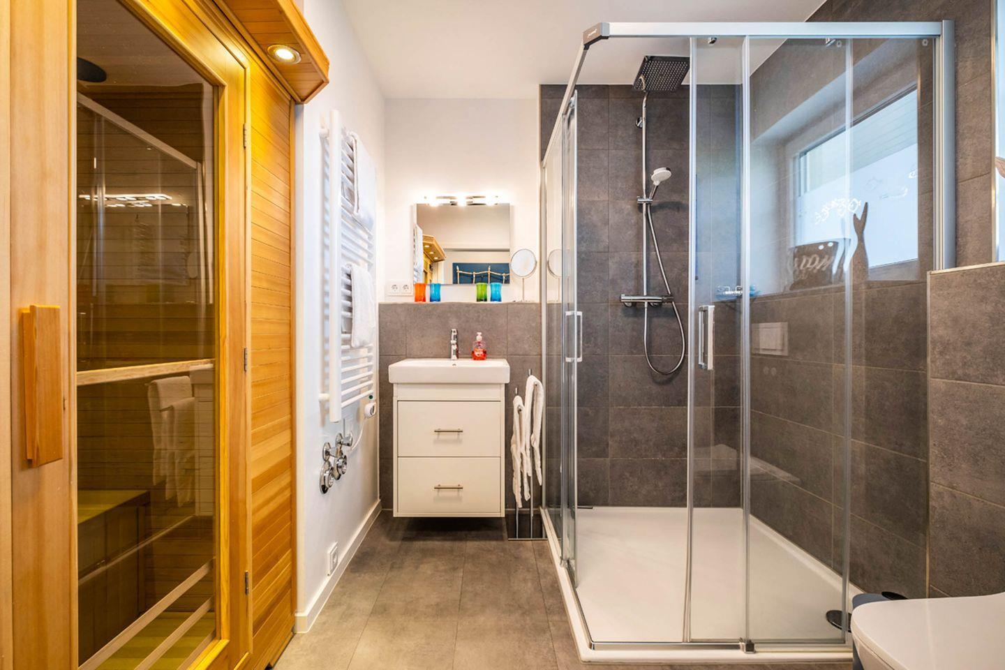 Das geräumige Badezimmer verfügt über eine große, ebenerdige Duschkabine mit Regenwasserdusche und eine „Sauna“ (Infrarot-Wärmekabine), in der Sie sich nach einem Spaziergang an der frischen Nordseeluft herrlich durchwärmen lassen können.