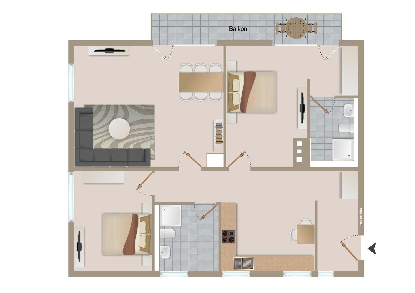 Ein heller Flur empfängt Sie mit einer modernen Garderobe und Zugängen zu sämtlichen Zimmern. Die Ferienwohnung bietet mit 2 Schlafzimmern Platz für 4 Personen. Das Hauptschlafzimmer bietet ein Duschbad en Suite und einen Zugang zum sonnigen Südbalkon. Beide Schlafzimmer sind mit einem hochwertigen Doppel-Boxspringbett (180 x 200) ausgestattet. Die Betten verfügen über Bettkästen, sodass Sie Ihre Koffer für die Urlaubszeit verstauen können. In beiden Schlafzimmern befinden sich wandhängende TV-Flatscreens für den individuellen Fernsehgenuss.