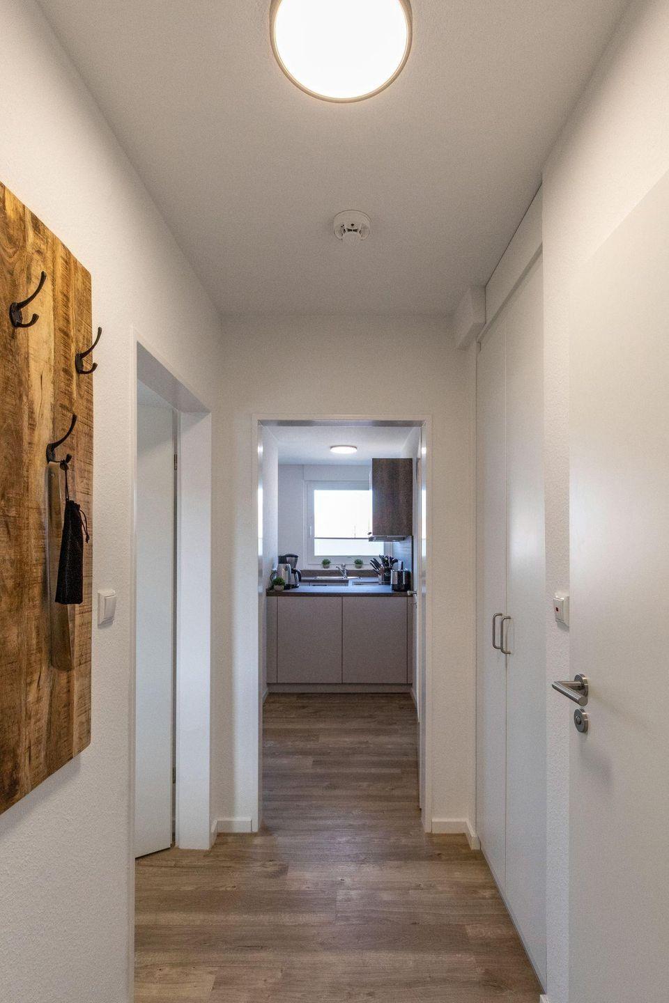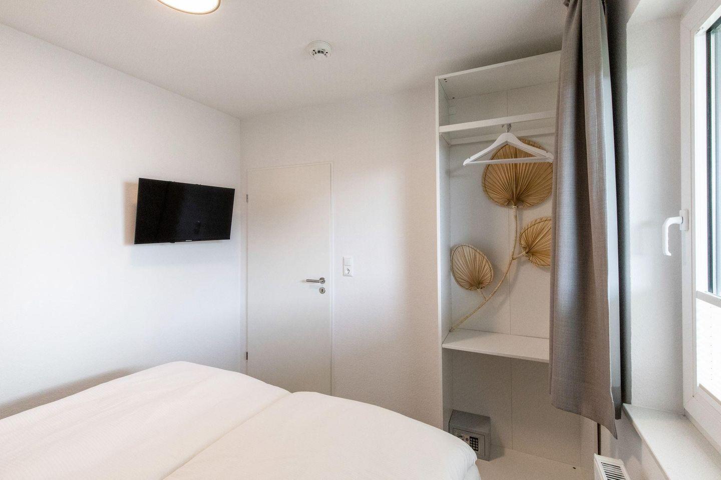 Ein heller Flur empfängt Sie mit einer modernen Garderobe und Zugängen zu sämtlichen Zimmern. Die Ferienwohnung bietet mit 1 Schlafzimmer Platz für 2 Personen. Das Schlafzimmer ist mit einem hochwertigen Doppel-Boxspringbett (160 x 200) ausgestattet und verfügt über einen Bettkasten, sodass Sie Ihre Koffer für die Urlaubszeit verstauen können. Im Schlafzimmer befindet sich ein wandhängendes TV-Flatscreen für den individuellen Fernsehgenuss.