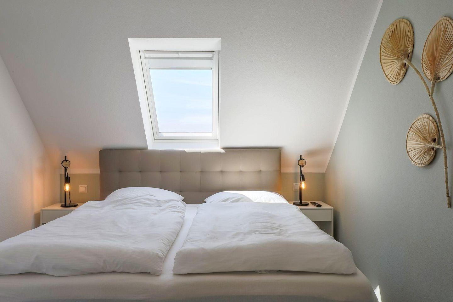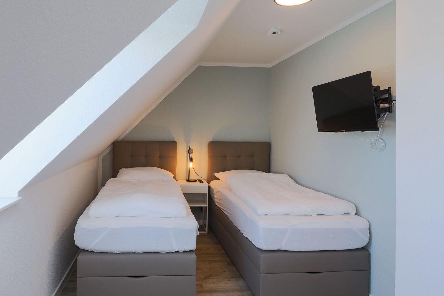 Ein heller Flur empfängt Sie mit einer modernen Garderobe und Zugängen zu sämtlichen Zimmern. Die Ferienwohnung bietet mit 2 Schlafzimmern Platz für 4 Personen. Eines der zwei Schlafzimmer ist mit einem hochwertigen Doppel-Boxspringbett (180 x 200) und ein weiteres mit 2 Einzelboxspringbetten (je 90 x 200) ausgestattet. Sämtliche Betten verfügen über Bettkästen, sodass Sie Ihre Koffer für die Urlaubszeit verstauen können. In beiden Schlafzimmern befinden sich wandhängende TV-Flatscreens für den individuellen Fernsehgenuss.