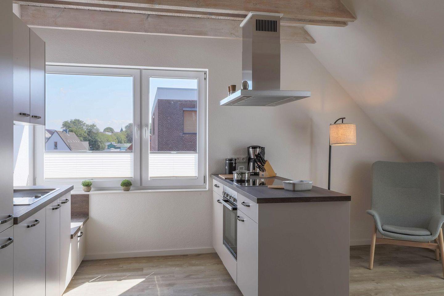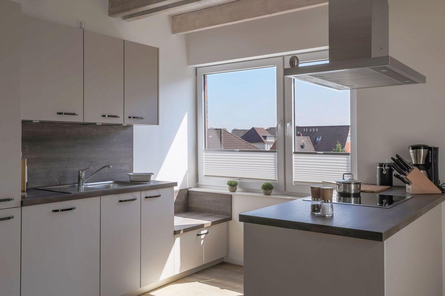 Küchenzeile: Cerankochfeld, Geschirrspüler, Kühlschrank mit Gefrierfach, Filterkaffee, Wasserkocher, Toaster