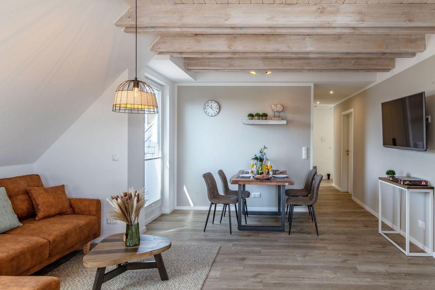 Ein modernes Tageslichtbad bietet eine große komfortable Dusche mit niedrigem Einstieg sowie eine Handtuchheizung. Das Herzstück der Wohnung ist das gemütliche Wohnzimmer mit einer hochwertigen, offenen Küche. Die großzügige Küche ist ausgestattet mit einer Spülmaschine, ein Cerankochfeld, eine Filterkaffeemaschine und einen Kühlschrank, der mit einem Gefrierfach versehen ist. Neben der Küche bietet eine kleine Leseecke Platz zur Entspannung. Eine kuschelige Couchgarnitur, ein großer TV-Flatscreen und ein Essbereich vervollständigen den Wohn-und Küchenbereich. Von hier gelangen Sie auf den sonnigen Südbalkon, ausgestattet mit hochwertigen Balkonmöbeln. Hier können Sie bei einem Glas Wein entspannte Abende mit Ihren Liebsten genießen.