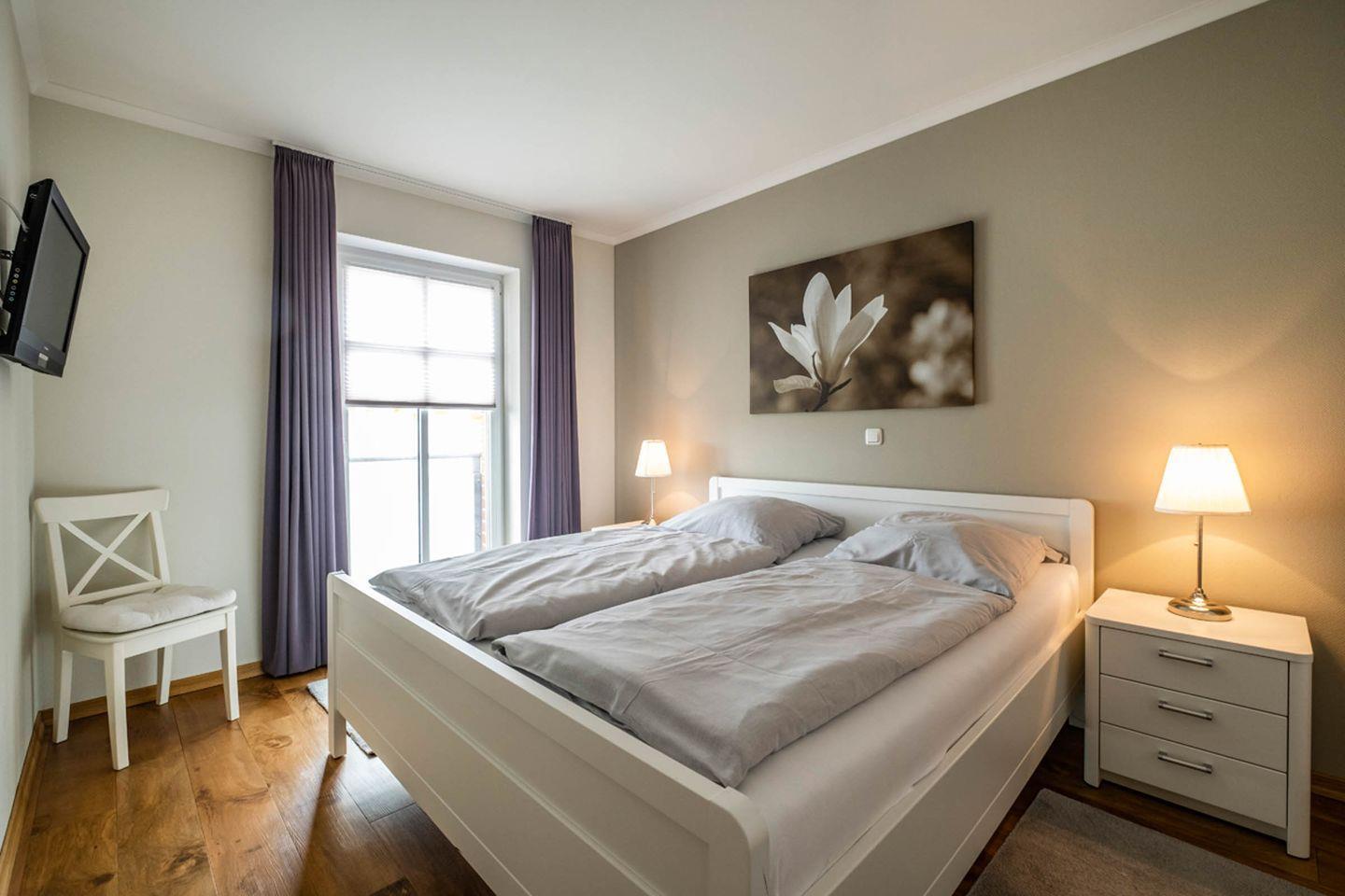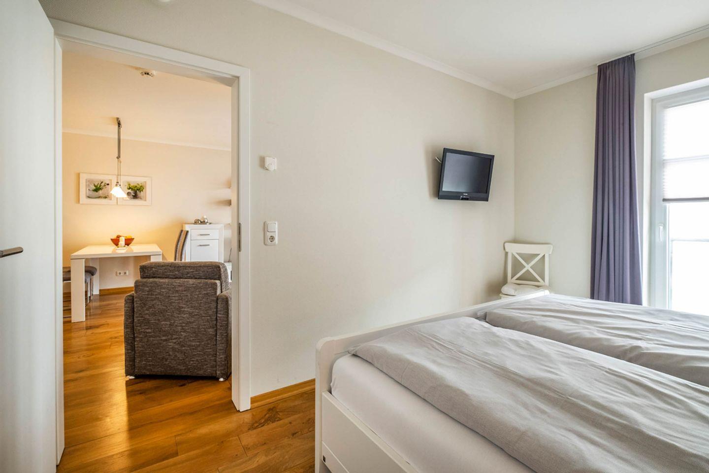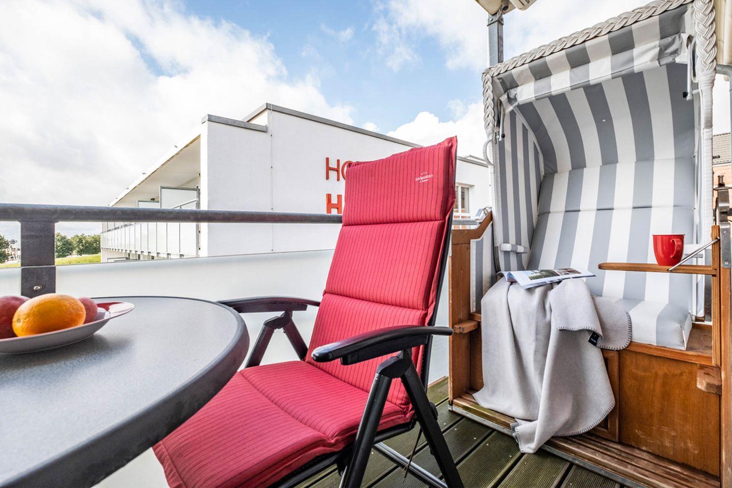 Das Appartement 2.2 mit Balkon liegt im zweiten Obergeschoss des Hauses Hafenresidenz. Im Wohnraum finden Sie eine gemütliche Couchgarnitur mit Sessel und Hocker. Die Küche und der Essbereich sind im Wohnbereich integriert. Das Schlafzimmer ist mit einen Doppelbett und TV-Wandmontage ausgestattet. Das geräumige Duschbad verfügt über einen Handtuchtrockner, Haltegriffe am WC und in der Dusche. Die Dusche hat eine kleine Einstiegskante. Fußbodenheizung im ganzen Appartement. Vom Wohnzimmer gelangen Sie auf den Balkon, der in Südwestlage liegt. Das Appartement verfügt über elektrische Außenjalousien und über eine Gegensprechanlage mit Kamera. Im Erdgeschoß des Hauses finden Sie Waschmaschine und Trockner (gebührenpflichtig) und einen Abstellraum für Fahrräder. Das Haus verfügt über einen Aufzug.