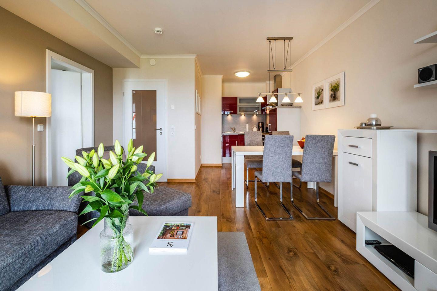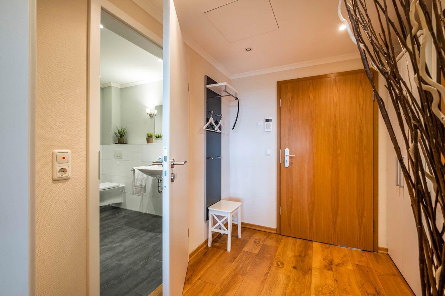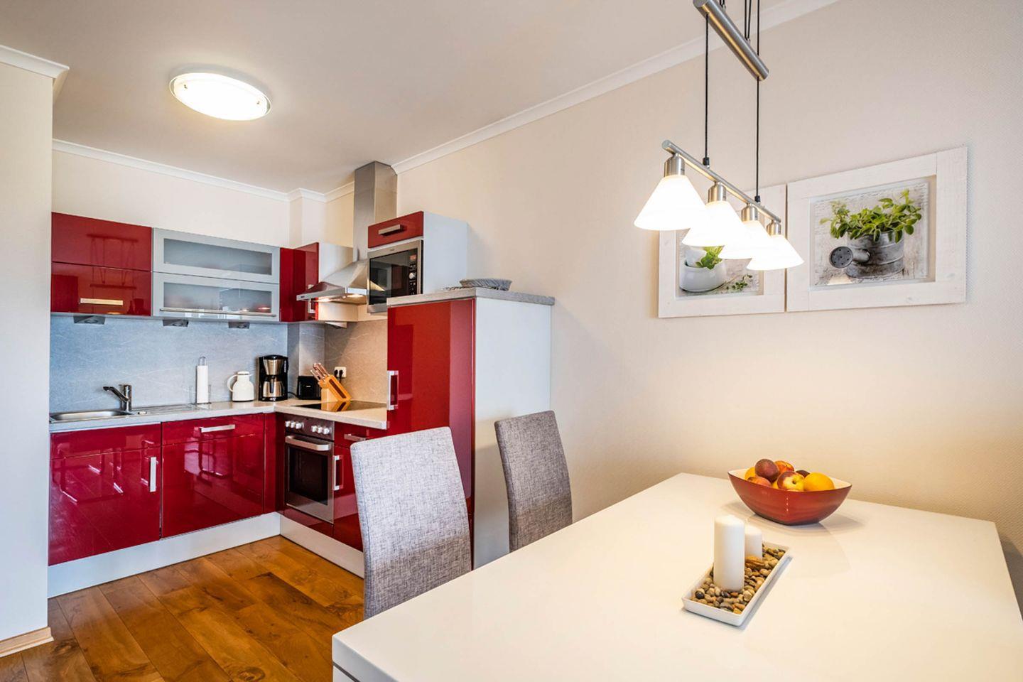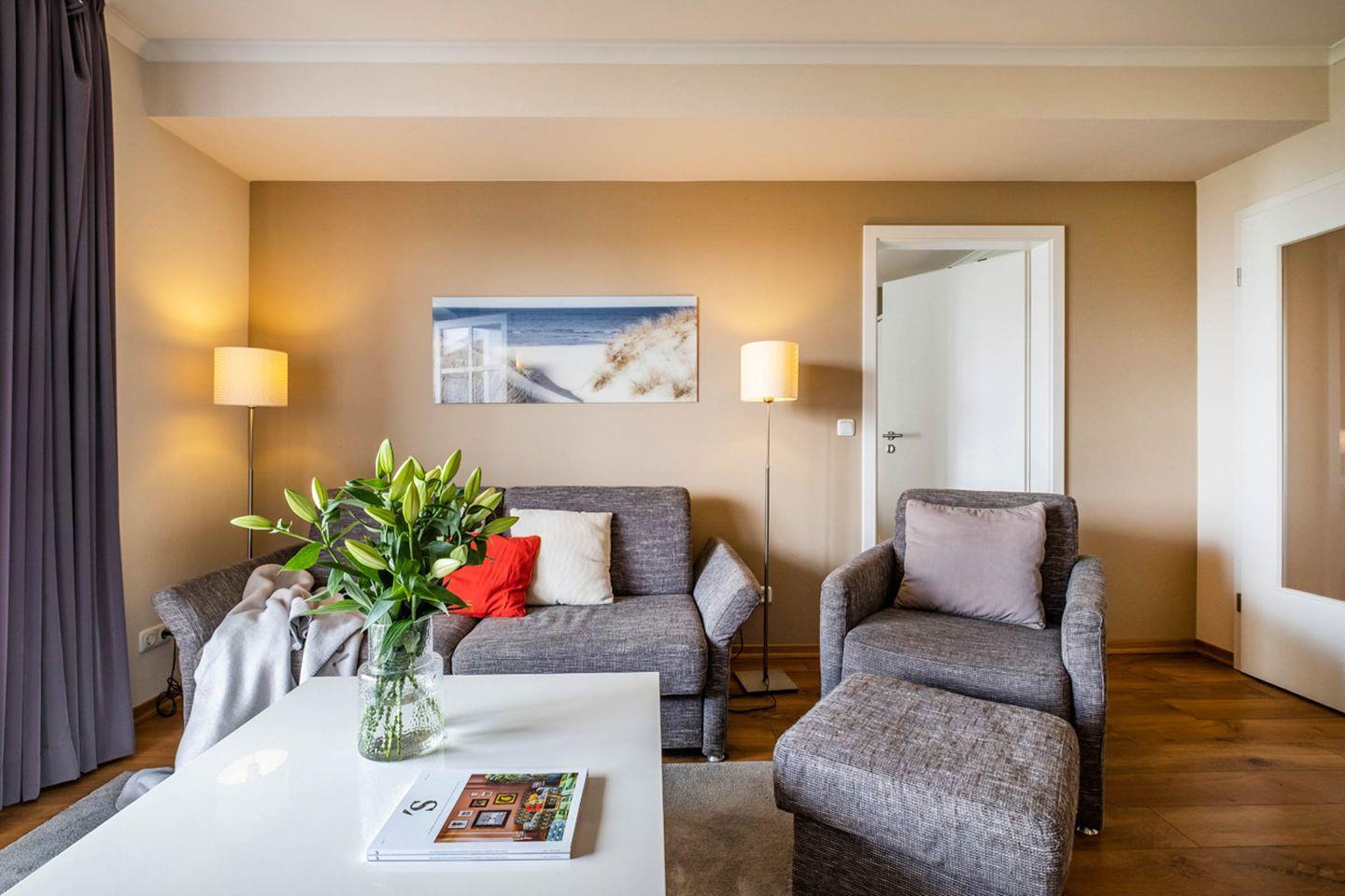 Das Appartement 2.2 mit Balkon liegt im zweiten Obergeschoss des Hauses Hafenresidenz. Im Wohnraum finden Sie eine gemütliche Couchgarnitur mit Sessel und Hocker. Die Küche und der Essbereich sind im Wohnbereich integriert. Das Schlafzimmer ist mit einen Doppelbett und TV-Wandmontage ausgestattet. Das geräumige Duschbad verfügt über einen Handtuchtrockner, Haltegriffe am WC und in der Dusche. Die Dusche hat eine kleine Einstiegskante. Fußbodenheizung im ganzen Appartement. Vom Wohnzimmer gelangen Sie auf den Balkon, der in Südwestlage liegt. Das Appartement verfügt über elektrische Außenjalousien und über eine Gegensprechanlage mit Kamera. Im Erdgeschoß des Hauses finden Sie Waschmaschine und Trockner (gebührenpflichtig) und einen Abstellraum für Fahrräder. Das Haus verfügt über einen Aufzug.