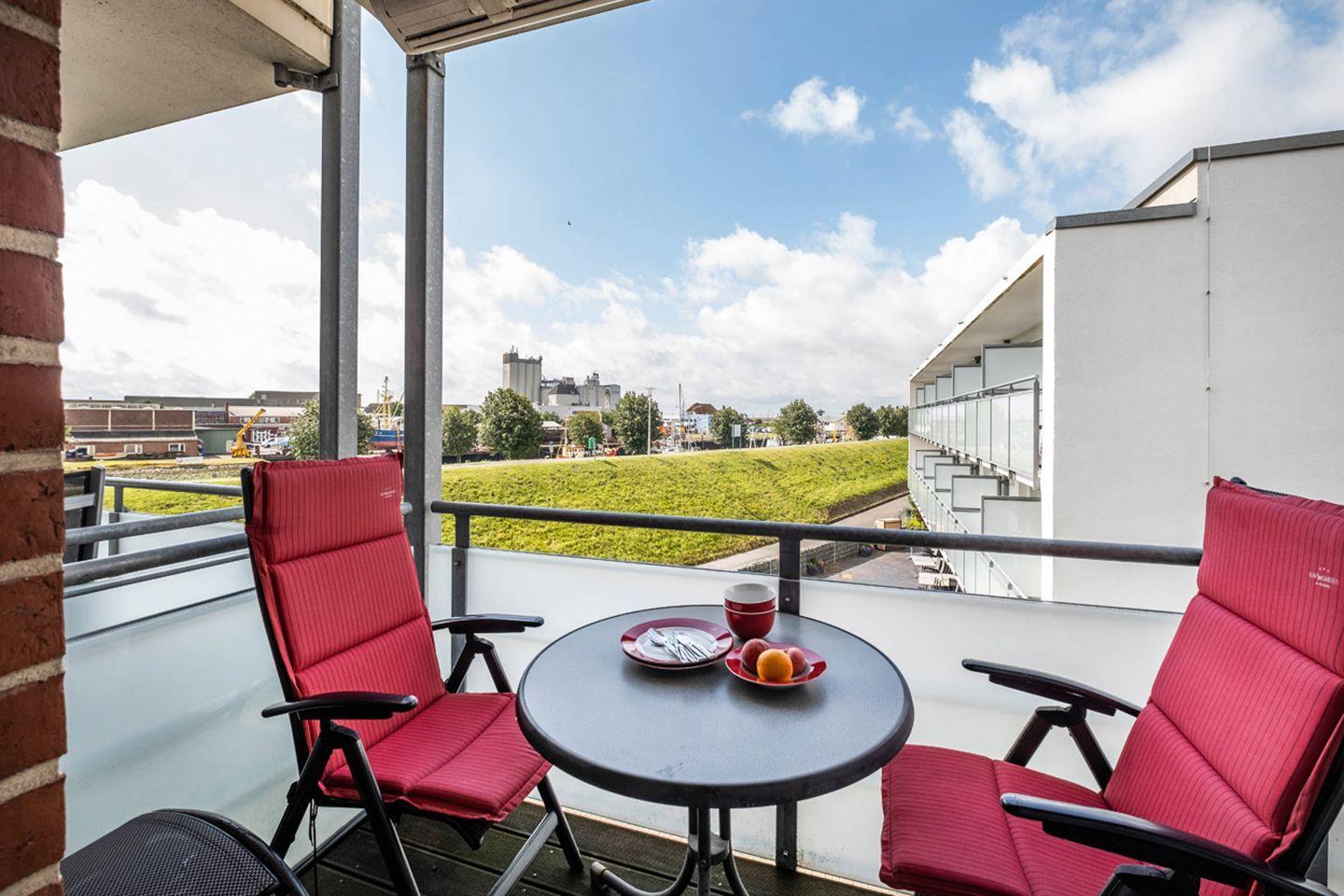 Moderne Ferienwohnung am Fischereihafen Büsum mit Meerblick und Balkon, nur 250 m vom Strand entfernt.