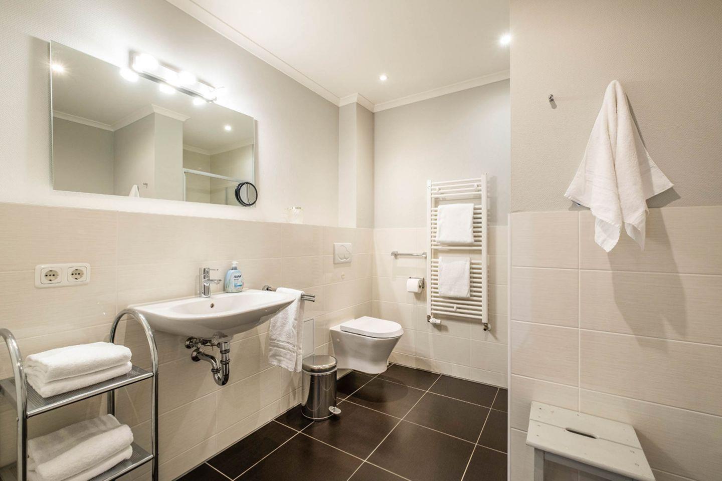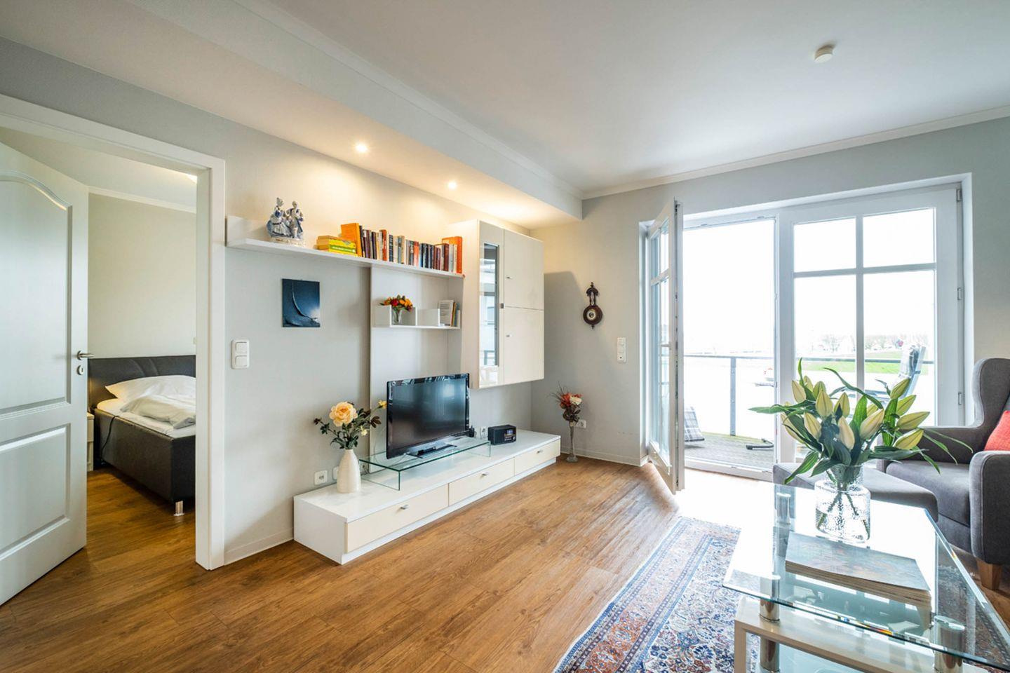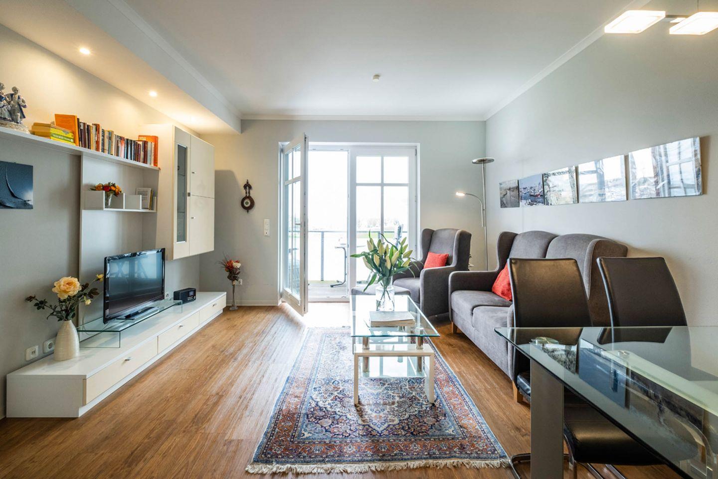 Das Appartement 2.3 mit Balkon liegt im zweiten Obergeschoss des Hauses Hafenresidenz. Im Wohnzimmer finden Sie eine gemütliche Couchgarnitur mit einen Fernsehsessel vor. Die Küche und der Essbereich sind im Wohnbereich integriert. Das Schlafzimmer ist mit einen Doppelbett und TV-Wandmontage ausgestattet. Die Lattenroste des Bettes sind elektrisch verstellbar. Das geräumige Duschbad verfügt über einen Handtuchtrockner, Haltegriffe am WC und in der Dusche. Die Dusche hat eine kleine Einstiegskante. Fußbodenheizung im ganzen Appartement. Vom Wohnzimmer gelangen Sie auf den Balkon, der in Südwestlage liegt. Das Appartement verfügt über elektrische Außenjalousien und über eine Gegensprechanlage mit Kamera. Im Erdgeschoß des Hauses finden Sie Waschmaschine und Trockner (gebührenpflichtig) und einen Abstellraum für Fahrräder. Das Haus verfügt über einen Aufzug.