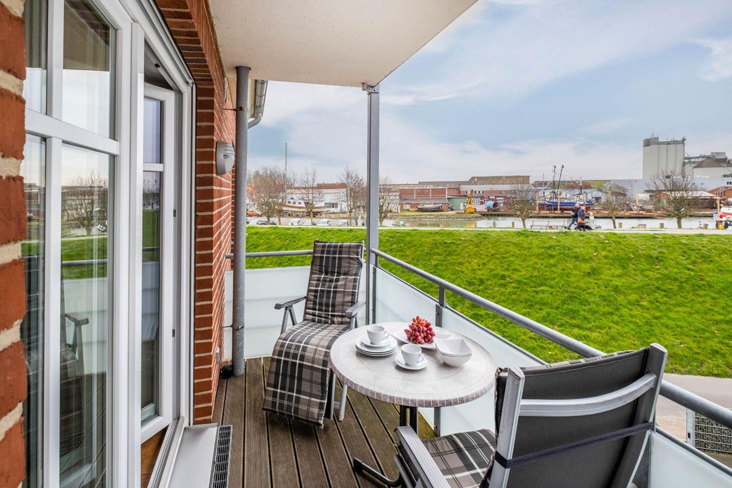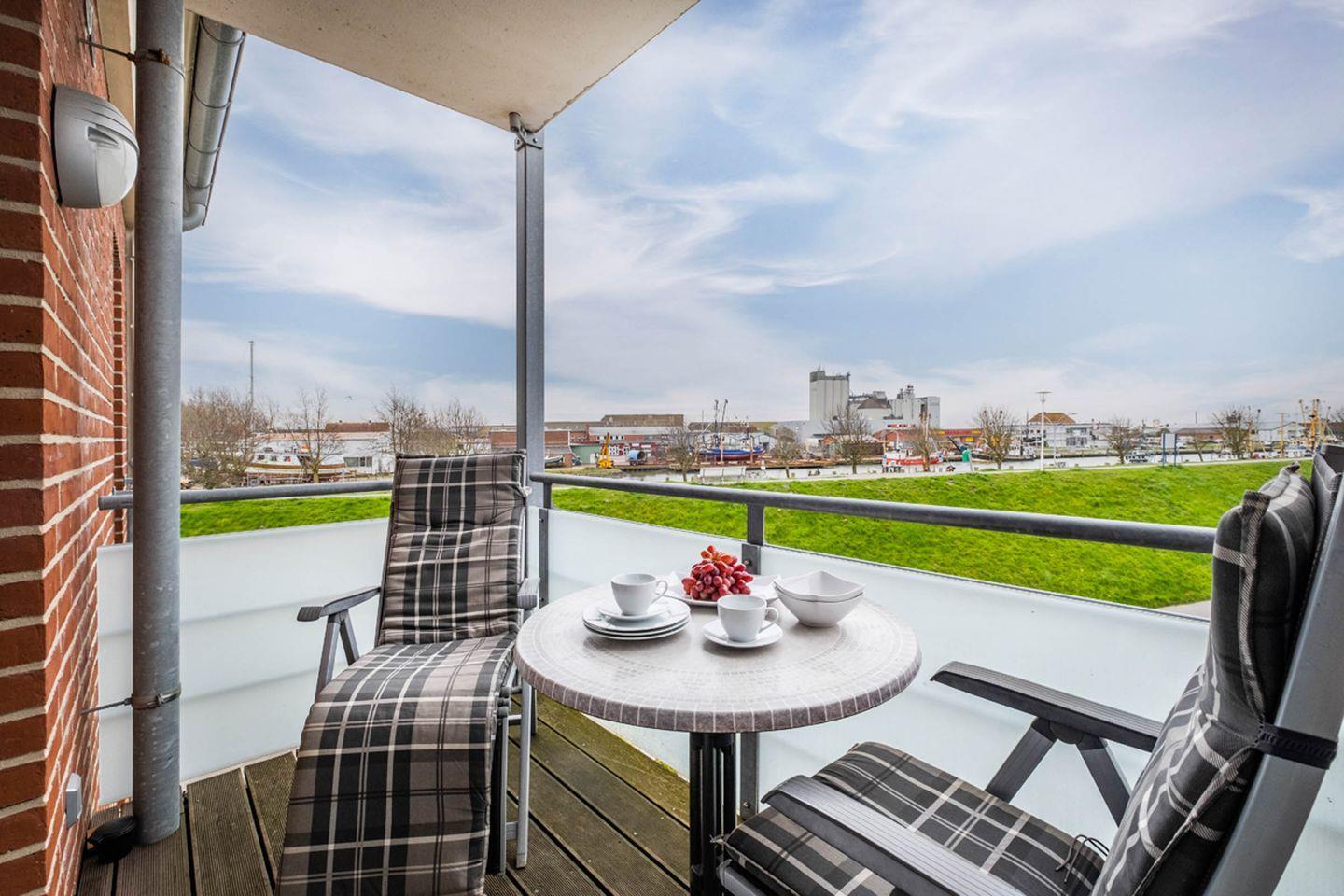 Moderne Ferienwohnung mit Balkon und Meerblick in Büsum, nahe Strand und Restaurants.