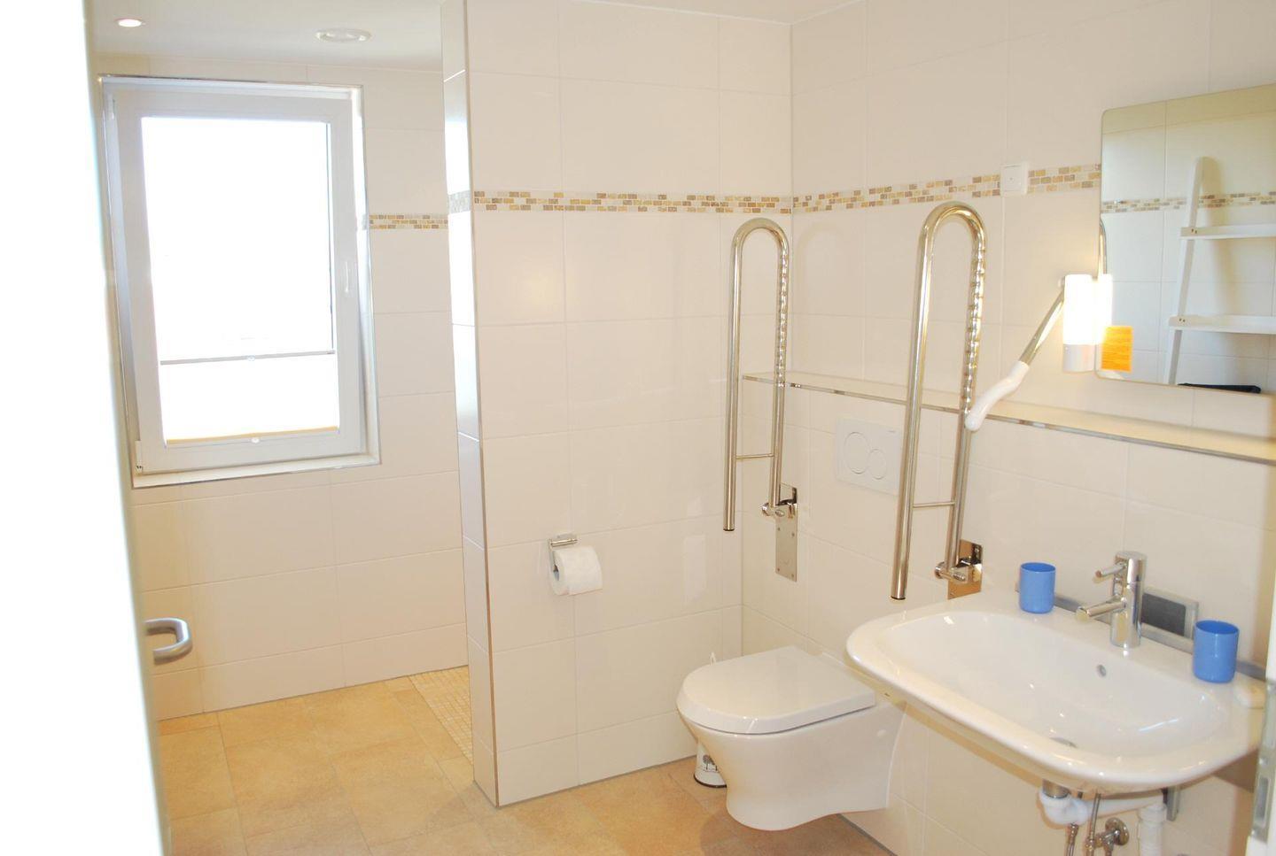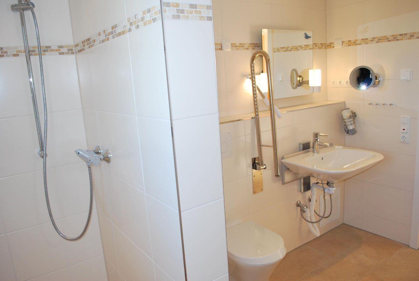 Sanitär: Duschbad mit barrierefreier Dusche, Haar-Föhn, Kosmetikspiegel, kippbarer Spiegel
