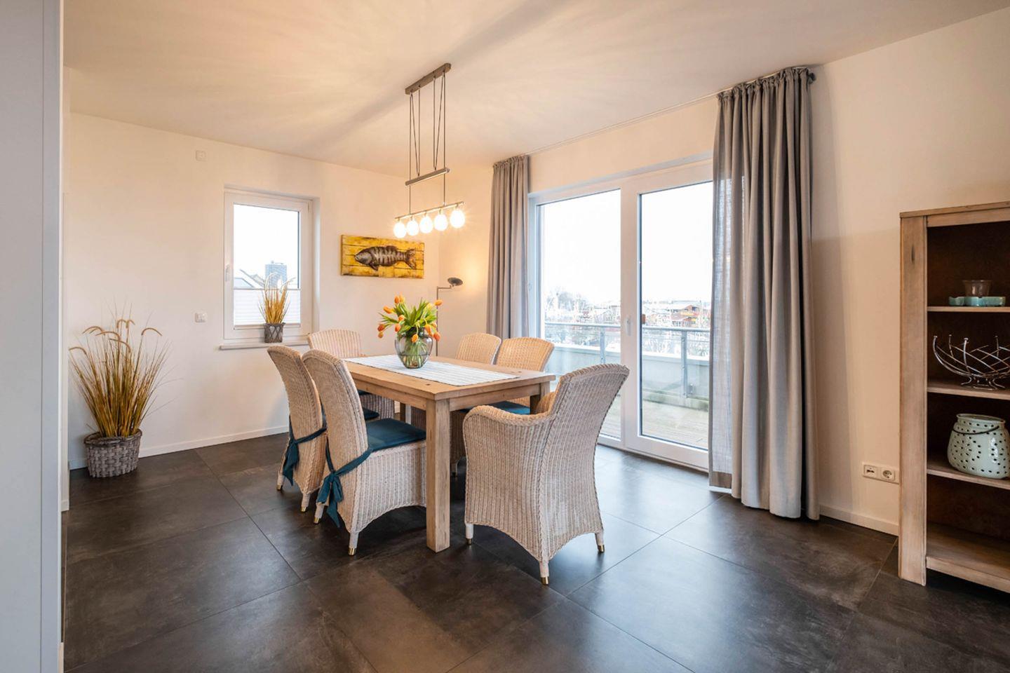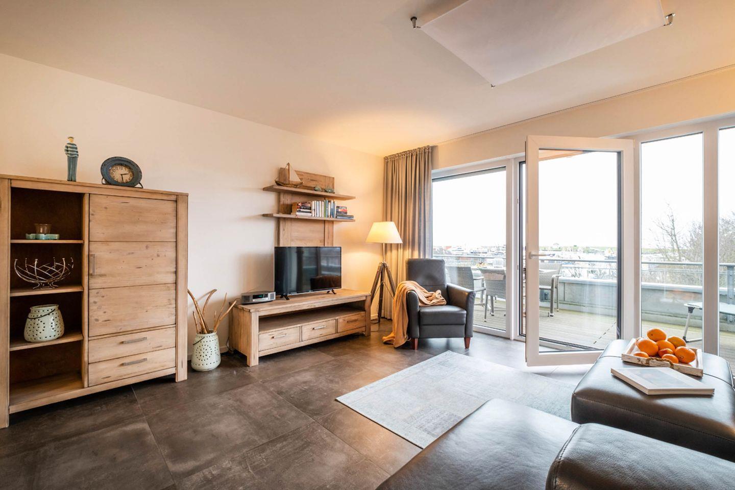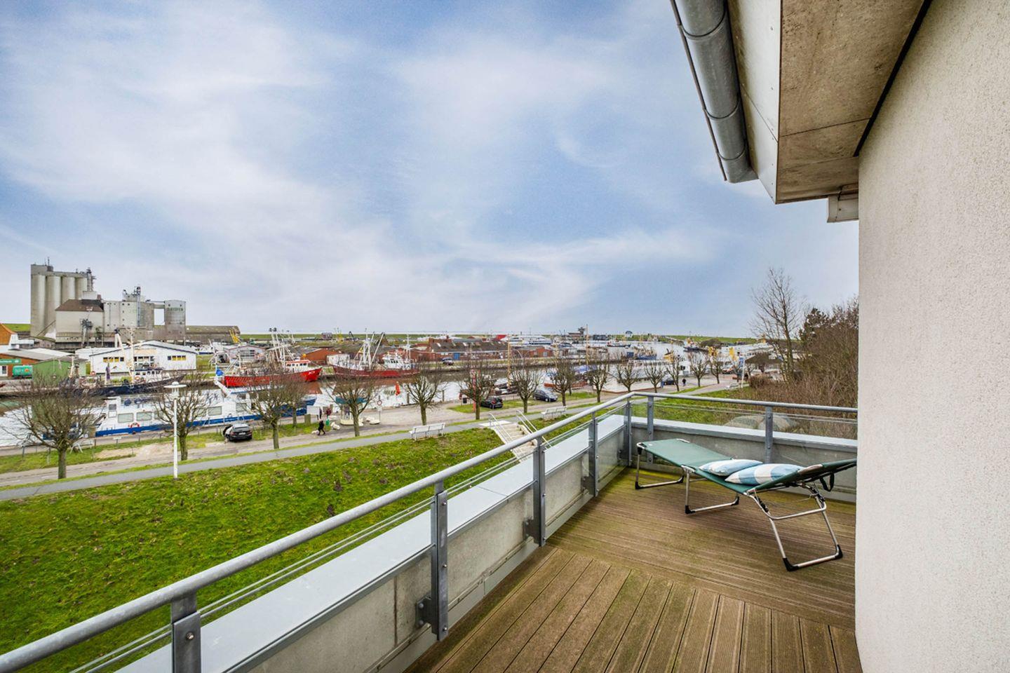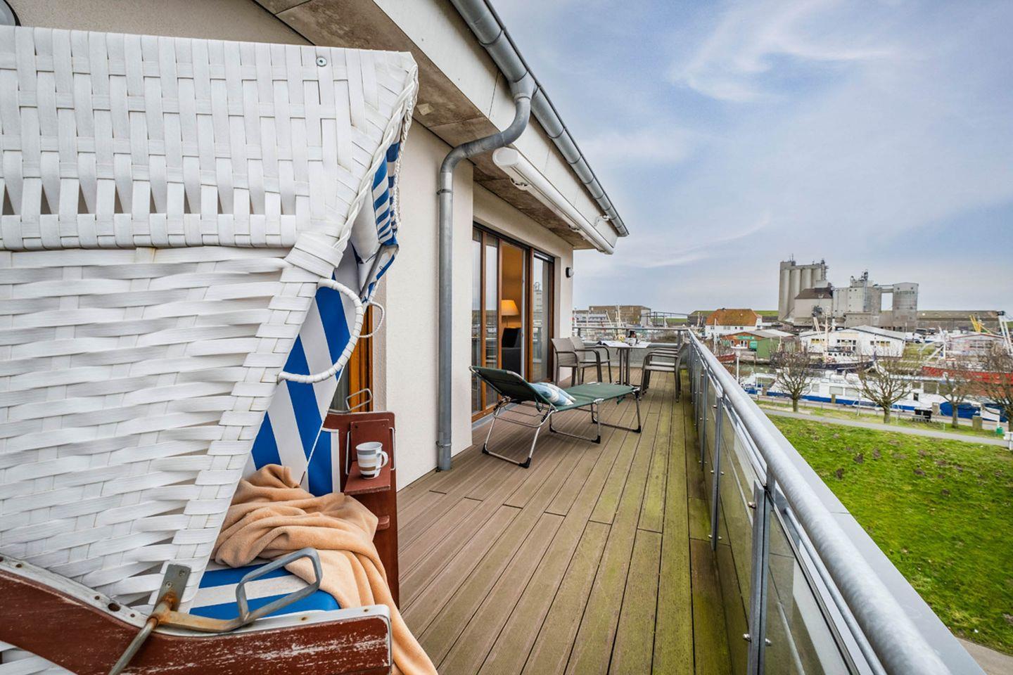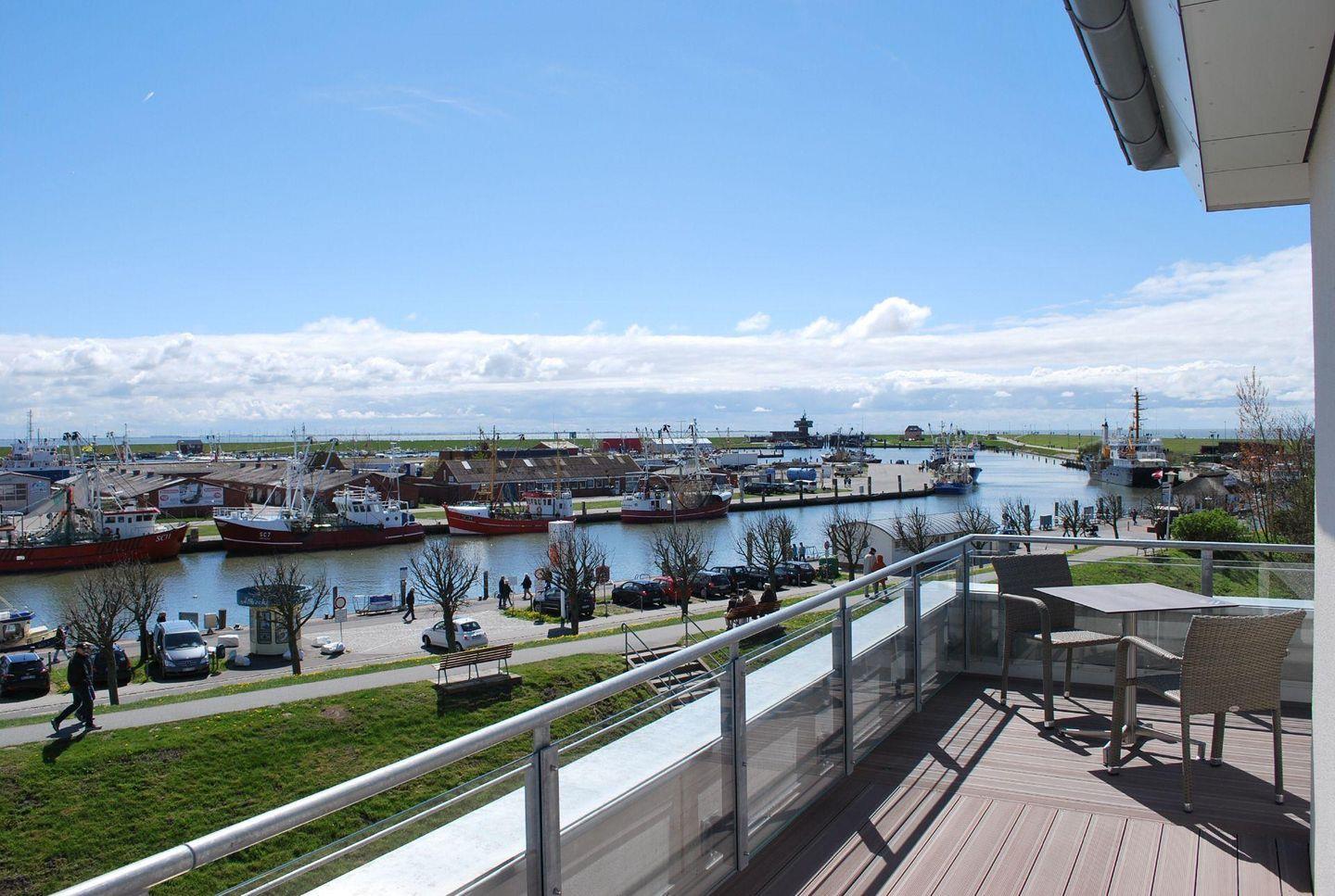 Moderne Ferienwohnung mit Balkon und Seeblick am Hafen von Büsum, ideal für entspannte Tage an der Nordsee.
