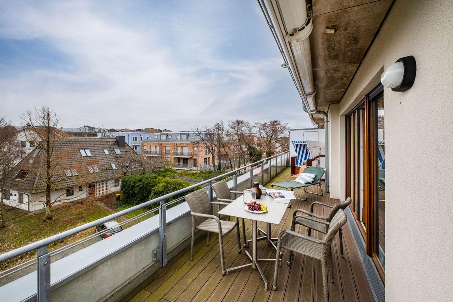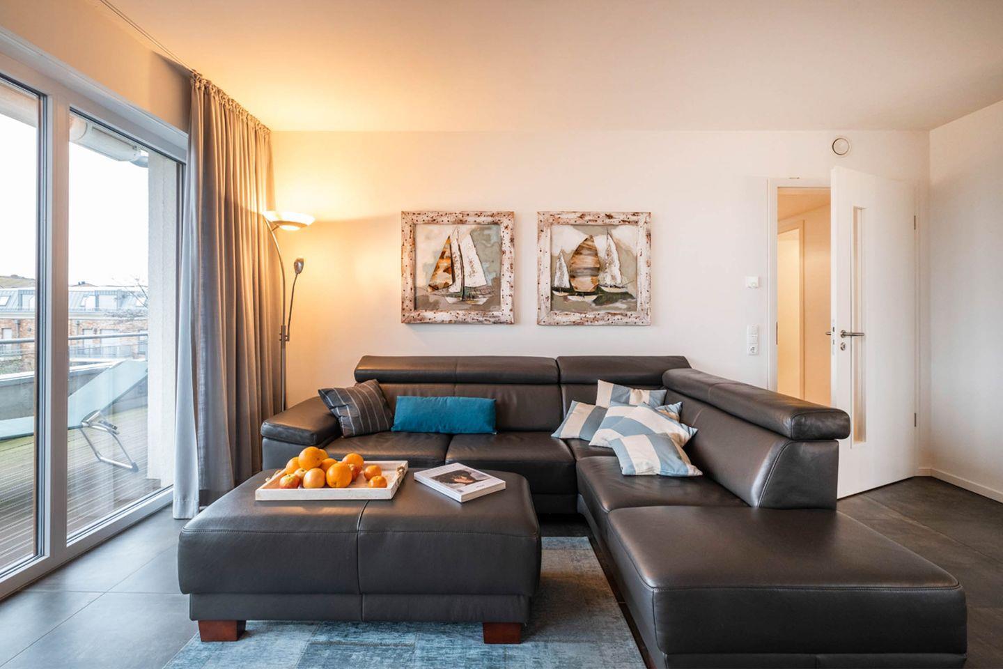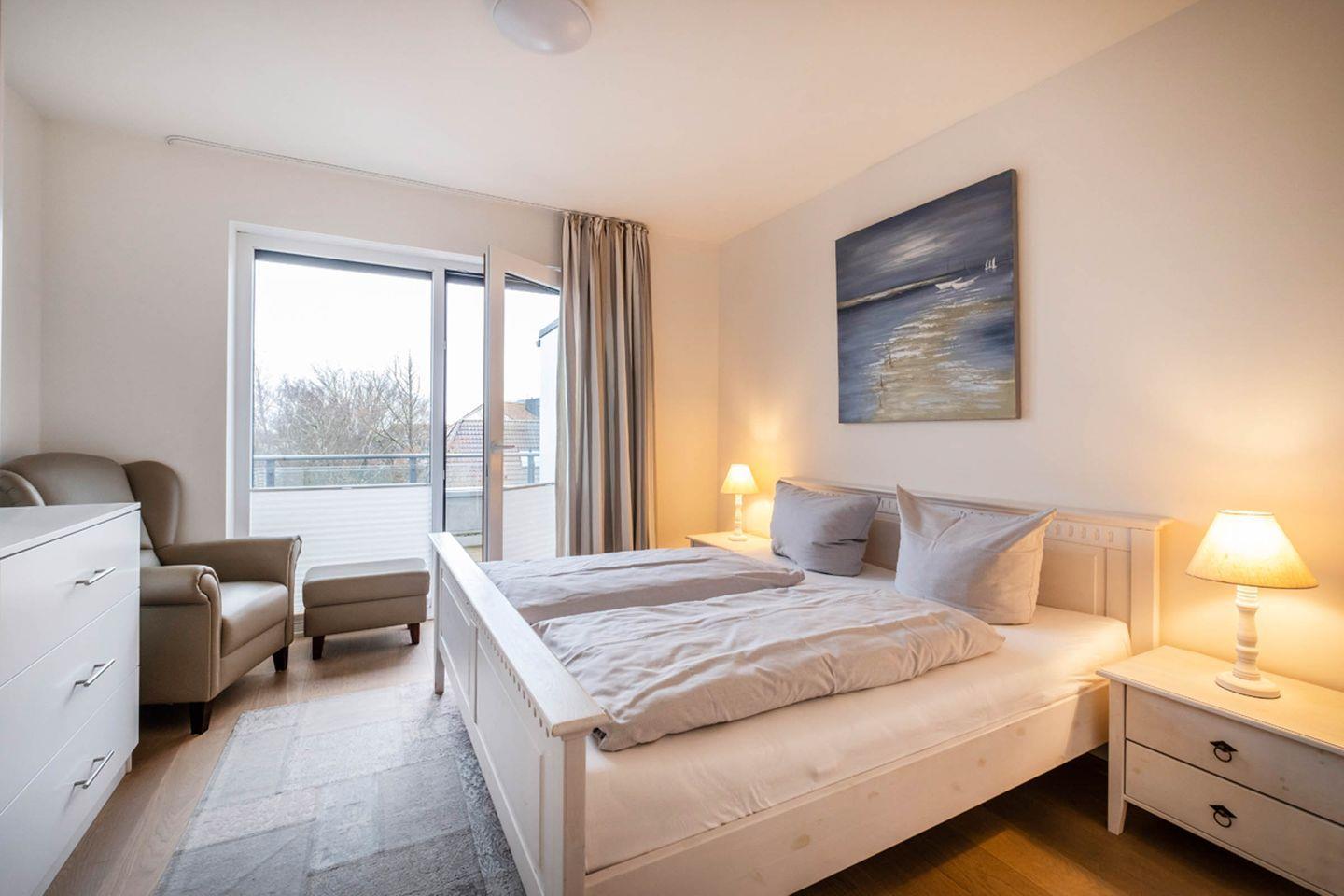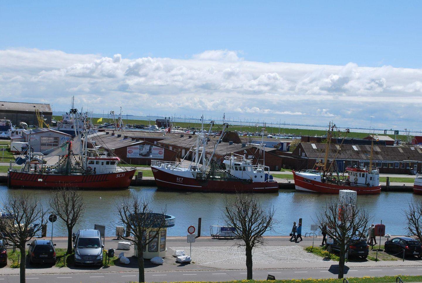 Moderne Ferienwohnung mit Balkon und Seeblick am Hafen von Büsum, ideal für entspannte Tage an der Nordsee.