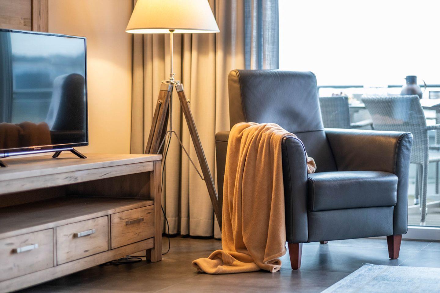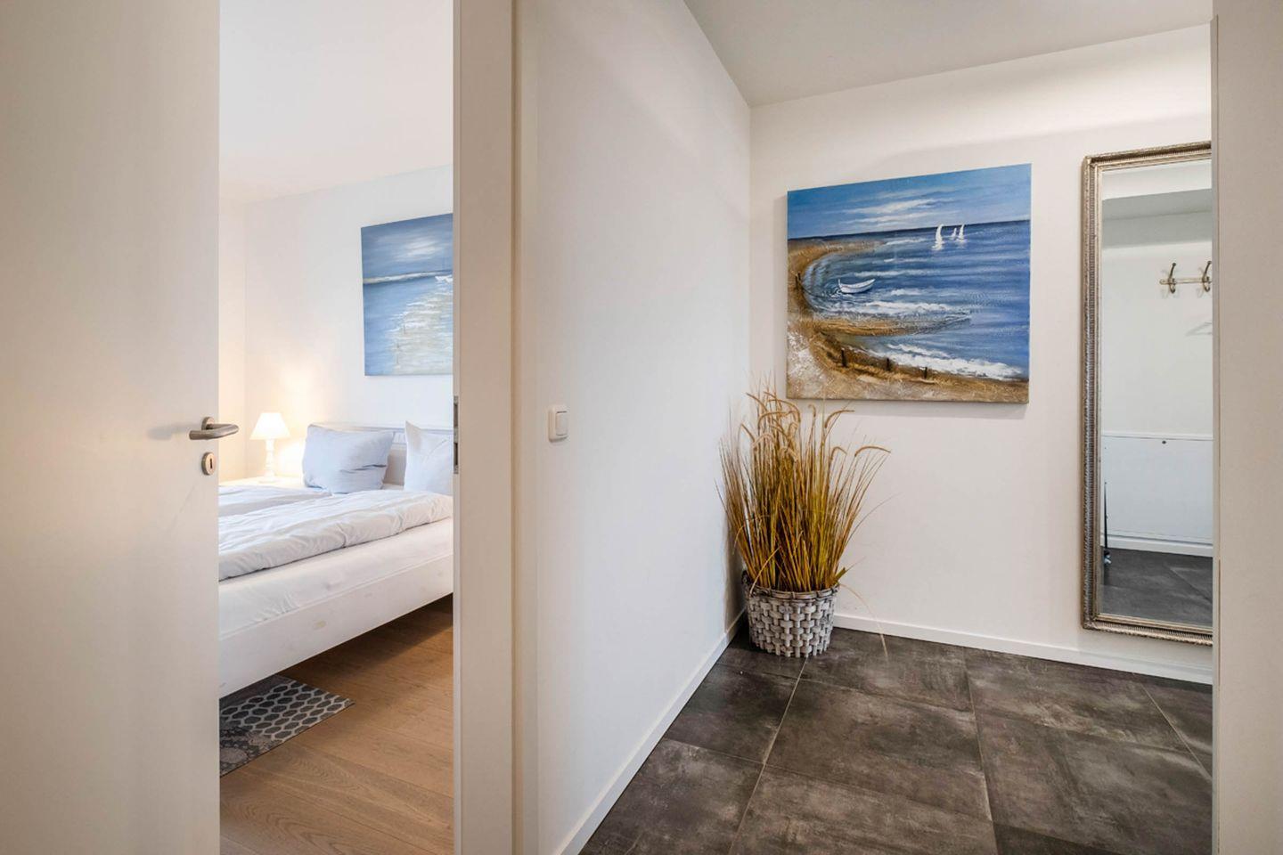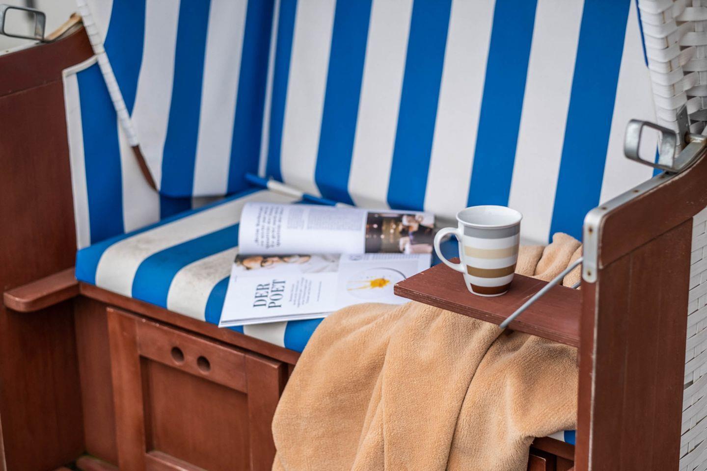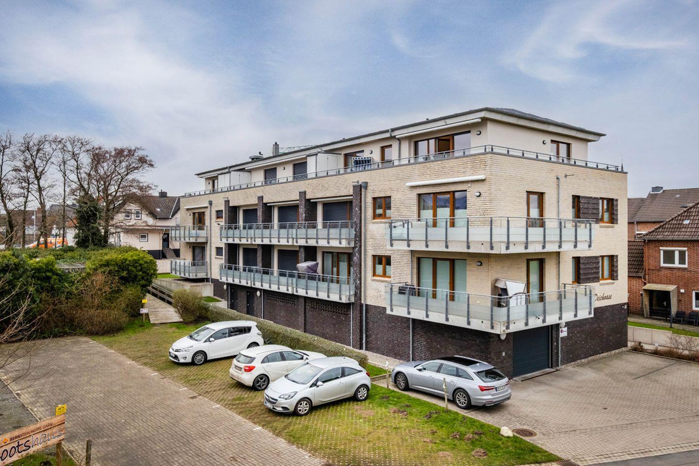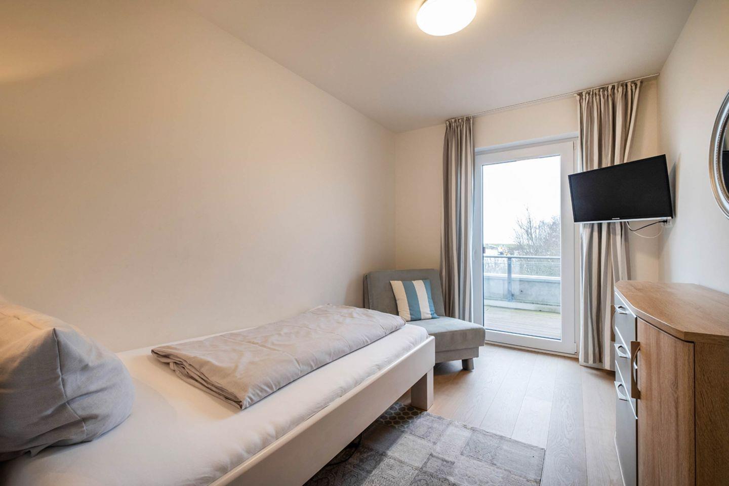 Moderne Ferienwohnung mit Balkon und Seeblick am Hafen von Büsum, ideal für entspannte Tage an der Nordsee.