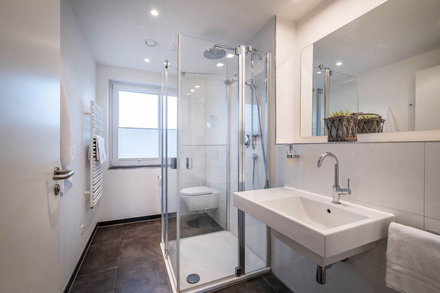 Sanitär: Duschbad mit barrierefreier Dusche, Haar-Föhn, Kosmetikspiegel