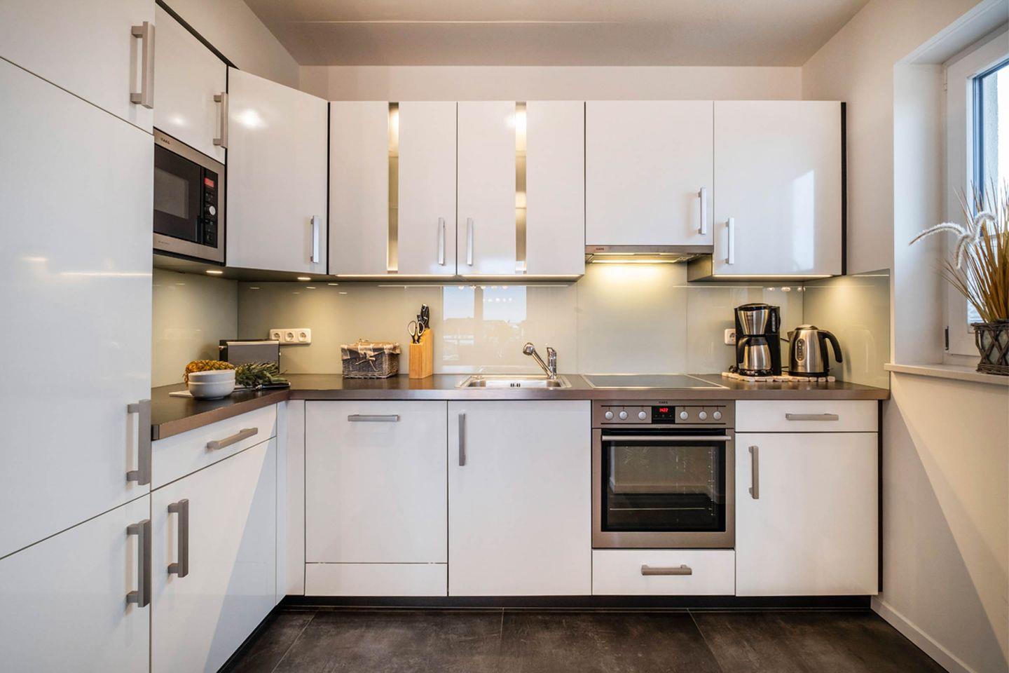 Küche: Geschirrspüler, Cerankochfeld, Mikrowelle, Backofen, Kühlschrank mit Gefrierfach.