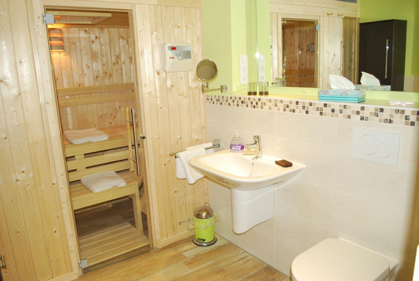 Sanitär: Duschbad mit barrierefreier Dusche, Fön, Kosmetikspiegel, Sauna mit Farblichtanlage