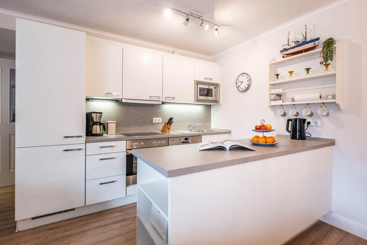 Küche: Backofen, Herd mit Cerankochfeld, Mikrowelle, Geschirrspüler, Kühlschrank mit Gefrierfach, Kaffeemaschine, Wasserkocher, Toaster