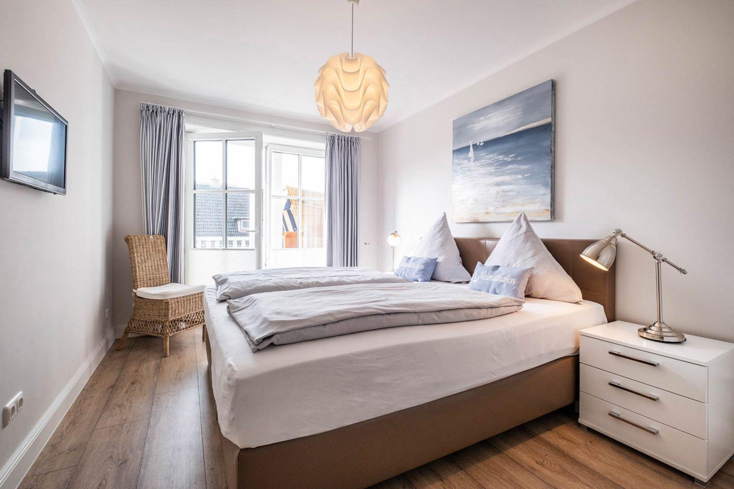 Das Appartement 2.1 befindet sich im I.OG mit Balkon. Im Wohnraum finden Sie eine gemütliche Couchgarnitur. Die Küche und der Essbereich sind im Wohnbereich integriert. Beide Schlafzimmer sind mit Boxspringbetten in Komforthöhe und eins auch mit TV ausgestattet. Das Bad verfügt über eine barrierefreie Dusche/WC und Sauna. Das Appartement verfügt zusätzlich über ein Gäste- WC. Fußbodenheizung befindet sich im ganzen Appartement. Den ersten Balkon erreichen Sie vom Wohnraum und den zweiten Balkon jeweils von den beiden Schlafzimmern. Das Appartement verfügt über eine Gegensprechanlage mit Kamera. Im Keller finden Sie Waschmaschine und Trockner (gebührenpflichtig), Abstellraum für Fahrräder und einen gemeinschaftlichen Fitnessraum. Aufzug im Haus. Am Haus finden Sie einen weiteren abschließbaren Fahrradabstellraum und einen kleinen Spielplatz für unsere kleinen Gäste.