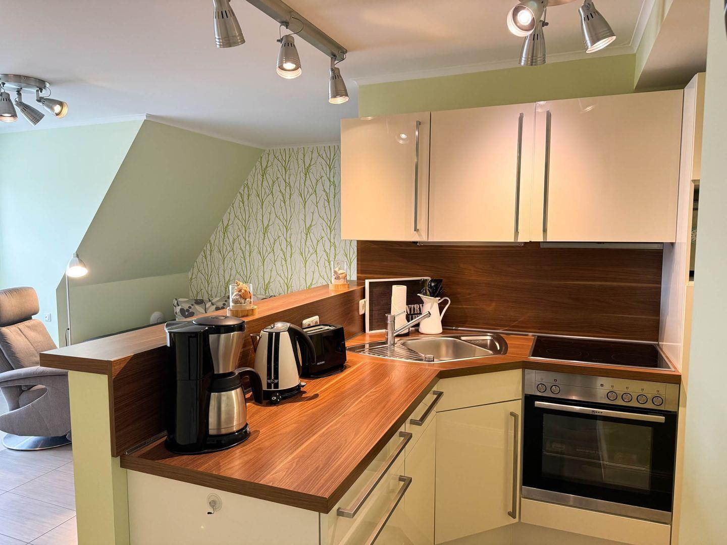 Küche: Backofen, Induktionsherd mit Cerankochfeld, Mikrowelle, Geschirrspüler, Kühlschrank mit Gefrierfach, Kaffeemaschine, Wasserkocher, Toaster