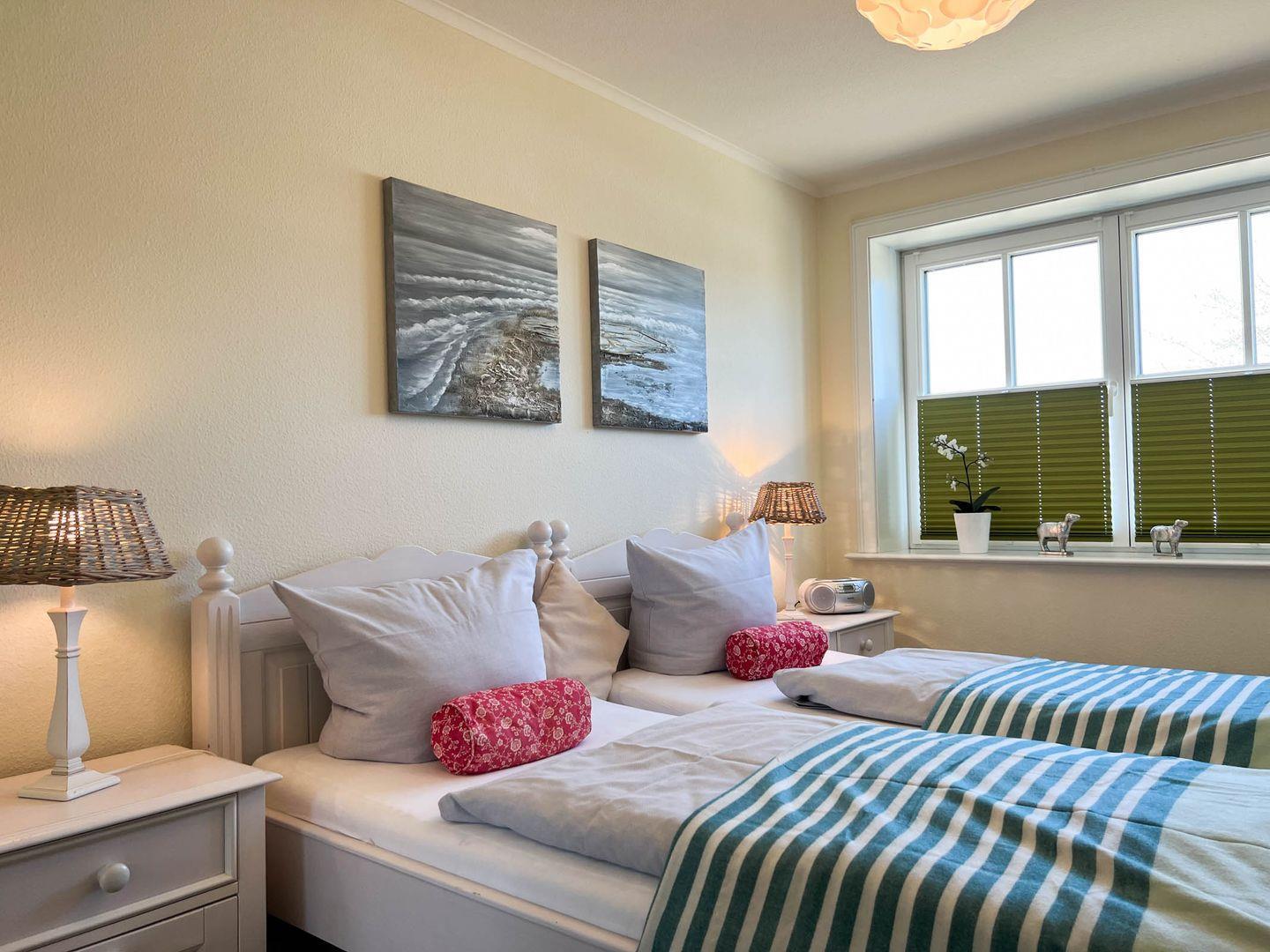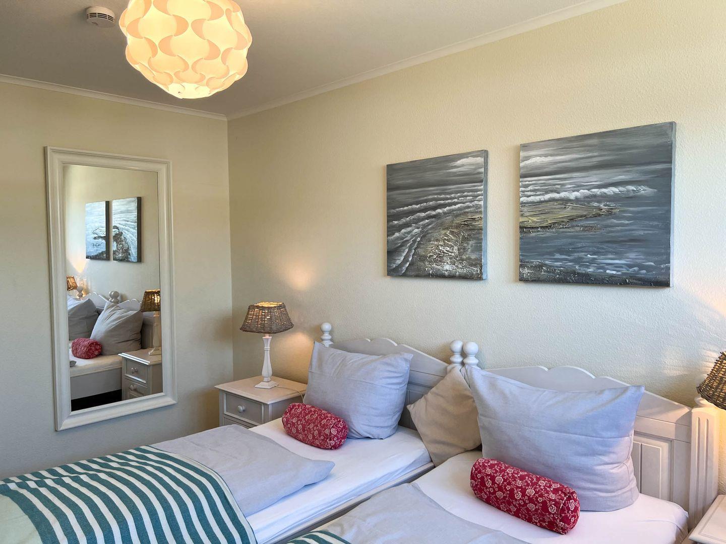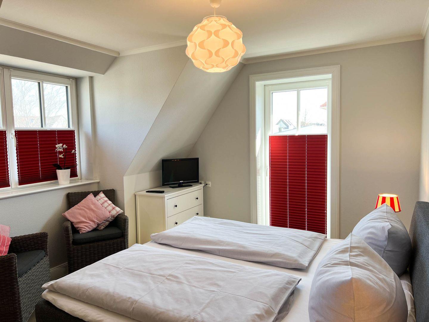 Das Appartement 2.6 befindet sich im I.OG mit Balkon. Im Wohnraum finden Sie eine gemütliche Couchgarnitur. Die Küche und der Essbereich sind im Wohnbereich integriert. Ein Schlafzimmer ist mit einem Boxspringbett in Komforthöhe und TV ausgestattet. Das zweite Schlafzimmer ist mit zwei zusammenstehenden Einzelbetten mit Komforthöhe und mit einem TV ausgestattet. Das Bad verfügt über eine barrierefreie Dusche/WC und Bidet. Das Appartement verfügt zusätzlich über ein Gäste- WC. Fußbodenheizung befindet sich im ganzen Appartement. Die beiden Balkone erreichen Sie vom Wohnraum . Das Appartement verfügt über eine Gegensprechanlage mit Kamera. Im Keller finden Sie Waschmaschine und Trockner (gebührenpflichtig), Abstellraum für Fahrräder und einen gemeinschaftlichen Fitnessraum. Aufzug im Haus. Am Haus finden Sie einen weiteren abschließbaren Fahrradabstellraum und einen kleinen Spielplatz für unsere kleinen Gäste.