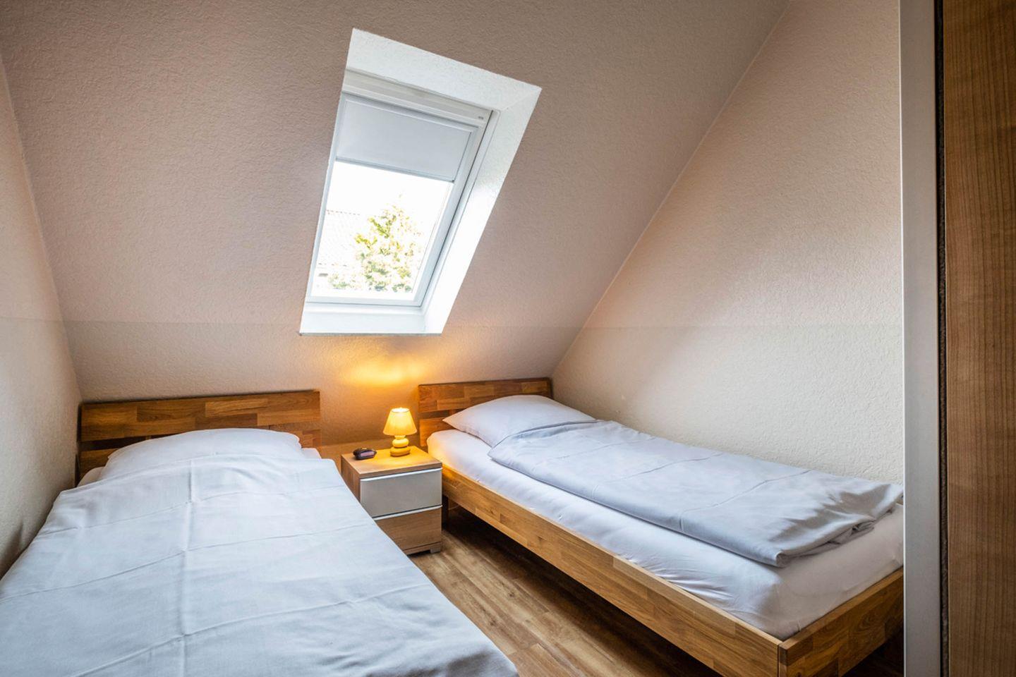 Im 1. Obergeschoss befinden sich 2 Schlafzimmer und 1 Gäste-WC. Das eine Schlafzimmer verfügt über ein Doppelbett und das zweite Schlafzimmer über 2 Einzelbetten.