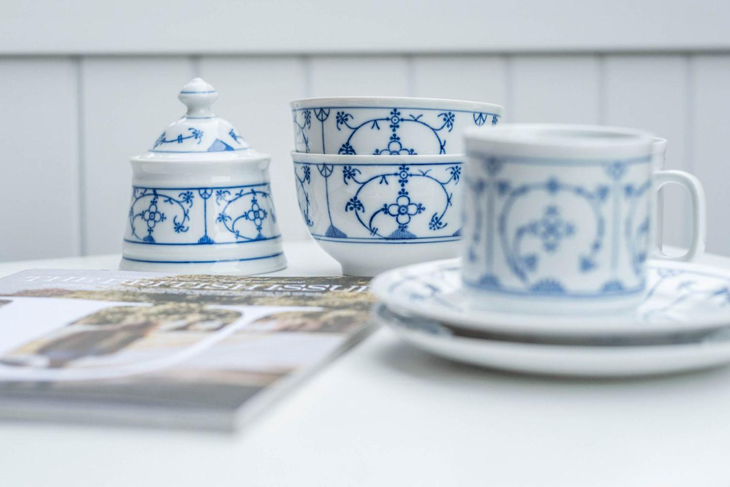 Küchenzeile: Geschirrspüler, Kochfeld, Mikrowelle, Kühlschrank mit Gefrierfunktion, Heißwasserkocher, Kaffeemaschine, Toaster.