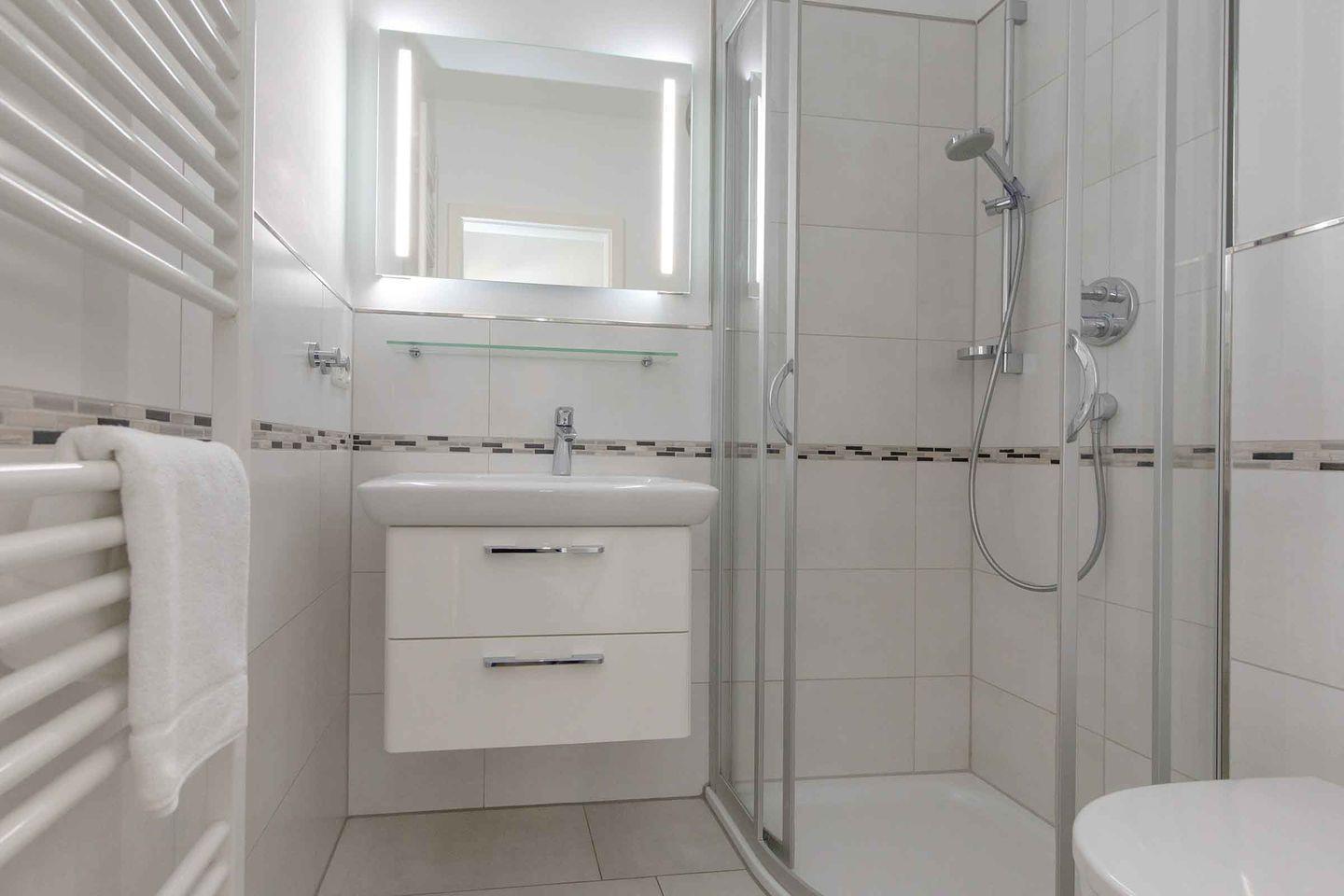 Das Bad verfügt über eine Dusche/WC. Vom Wohnbereich gelangen Sie auf den Balkon. Das eine Schlafzimmer verfügt über ein Doppelbett und einen Fernseher , das zweite Schlafzimmer über 2 Einzelbetten mit einem Fernsehgerät. Der Wohnung ist ein PKW - Stellplatz direkt am Haus zugehörig.