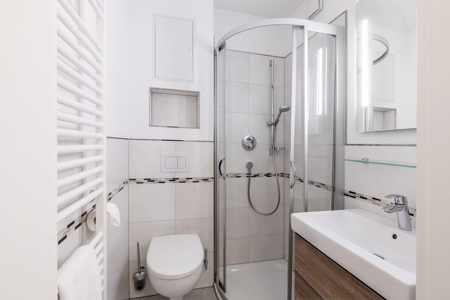 Das Bad verfügt über eine Dusche/WC. Vom Wohnbereich gelangen Sie auf die Terrasse. Das Schlafzimmer verfügt über ein Doppelbett und einen Fernseher. Der Wohnung ist ein PKW - Stellplatz direkt am Haus zugehörig.