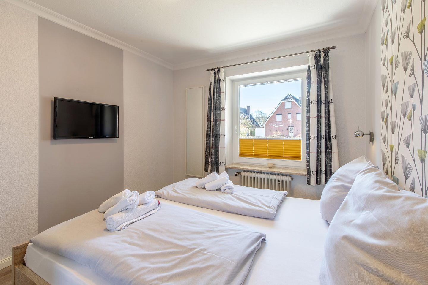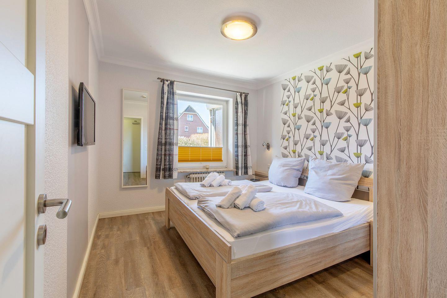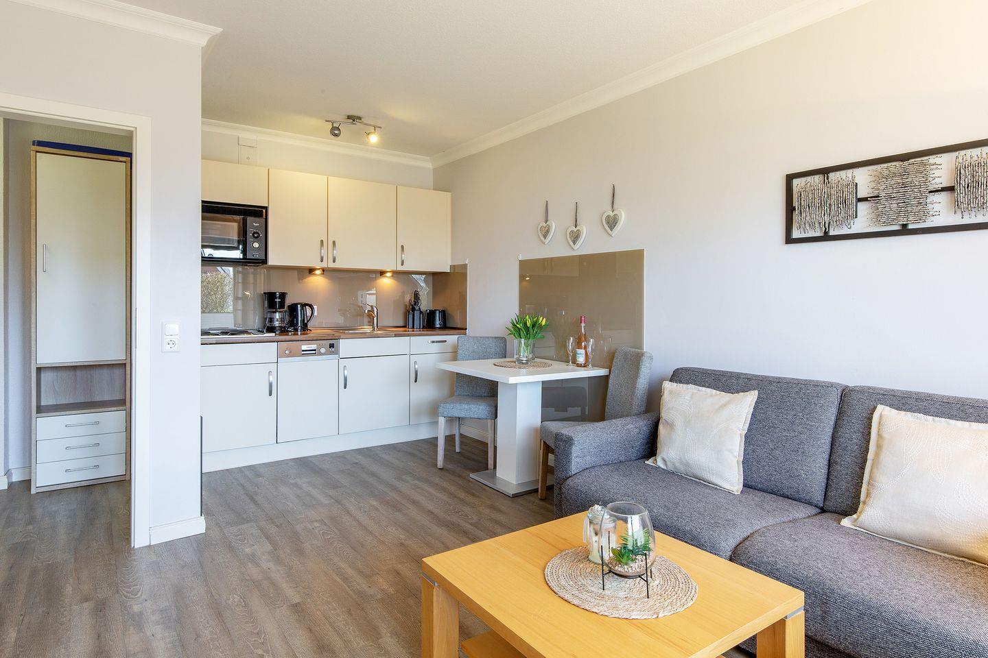 Haus Hoch am Wind Wohnung 2 in Büsum bietet auf 33 m² eine moderne, Nichtraucher-Ferienwohnung im Parterre mit Terrasse und Gartenmöbeln. Zur Ausstattung gehören offener Wohn- und Essbereich, voll ausgestattete Küche mit Spülmaschine, WLAN, TV, ein Schlafzimmer, Duschbad sowie ein Privatparkplatz. Haustiere bis max. 1 sind erlaubt. Strand, Einkaufsmöglichkeiten und Restaurants sind nur 250 Meter entfernt.