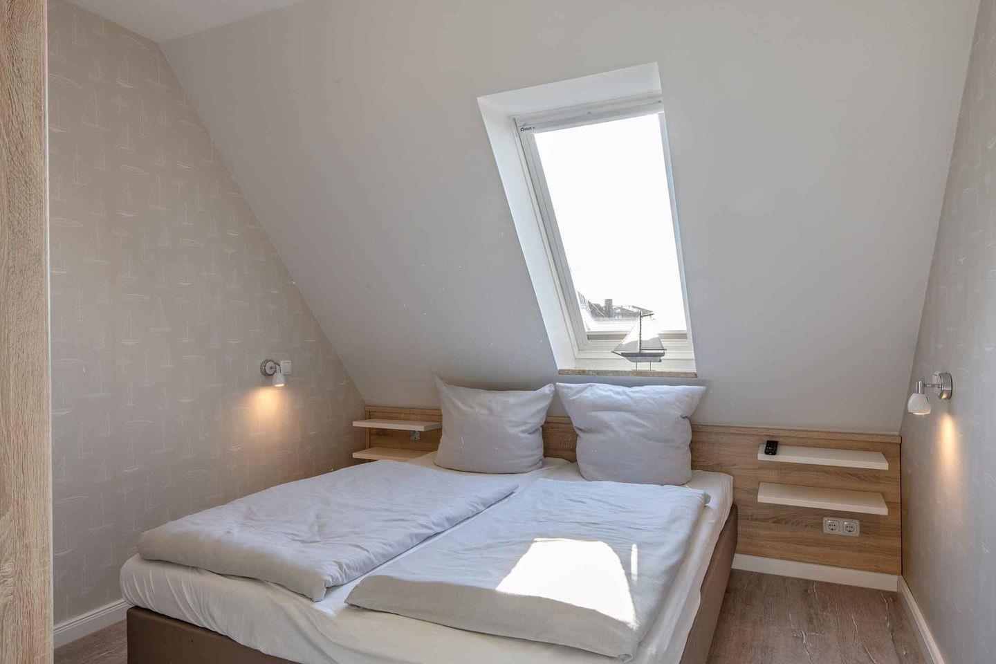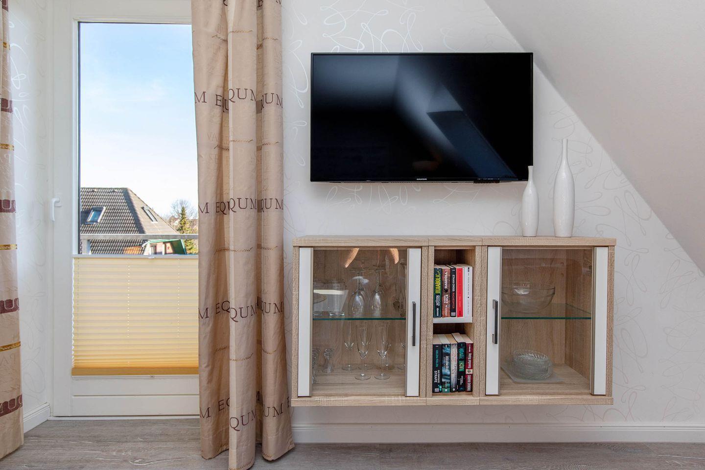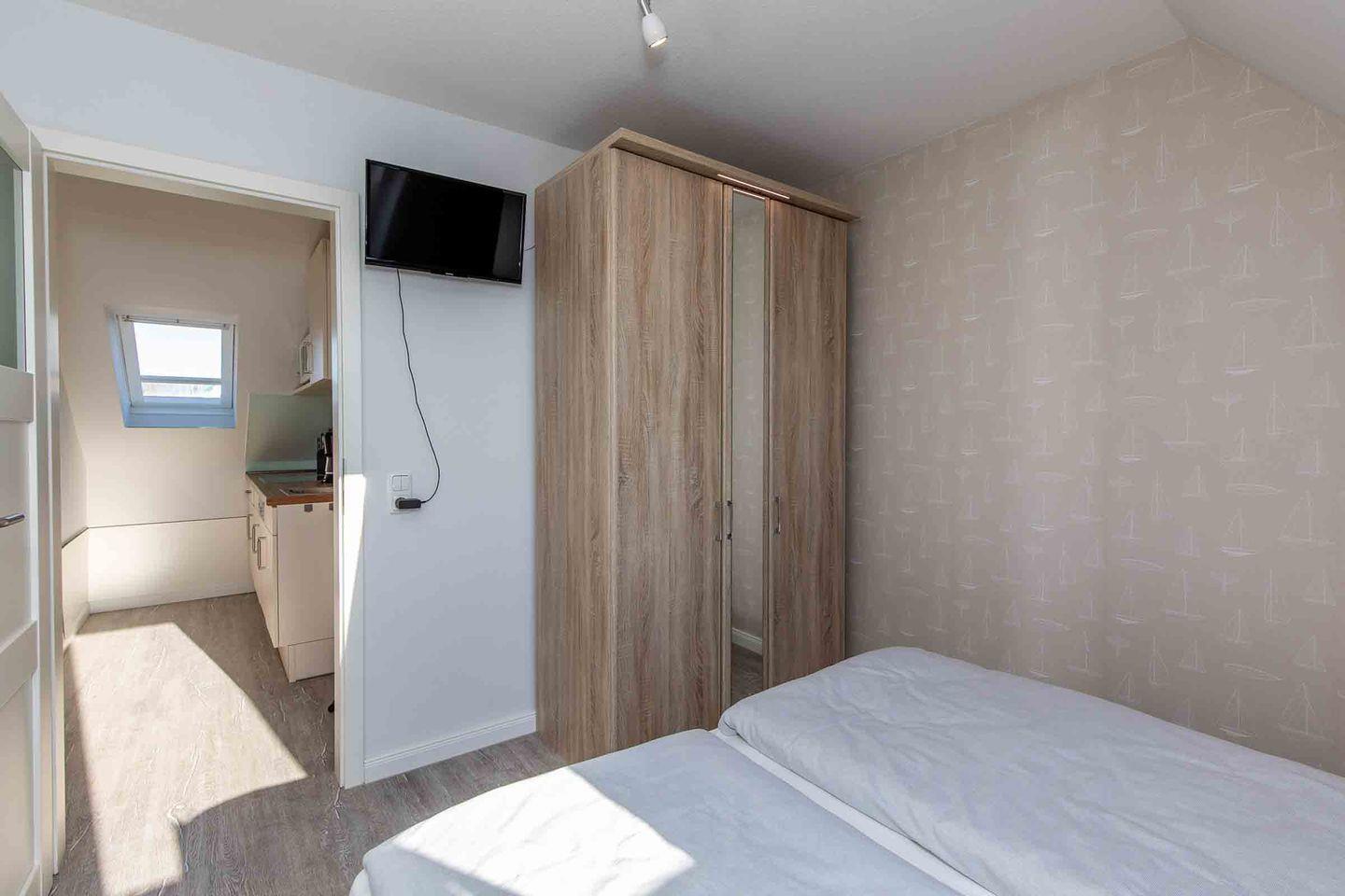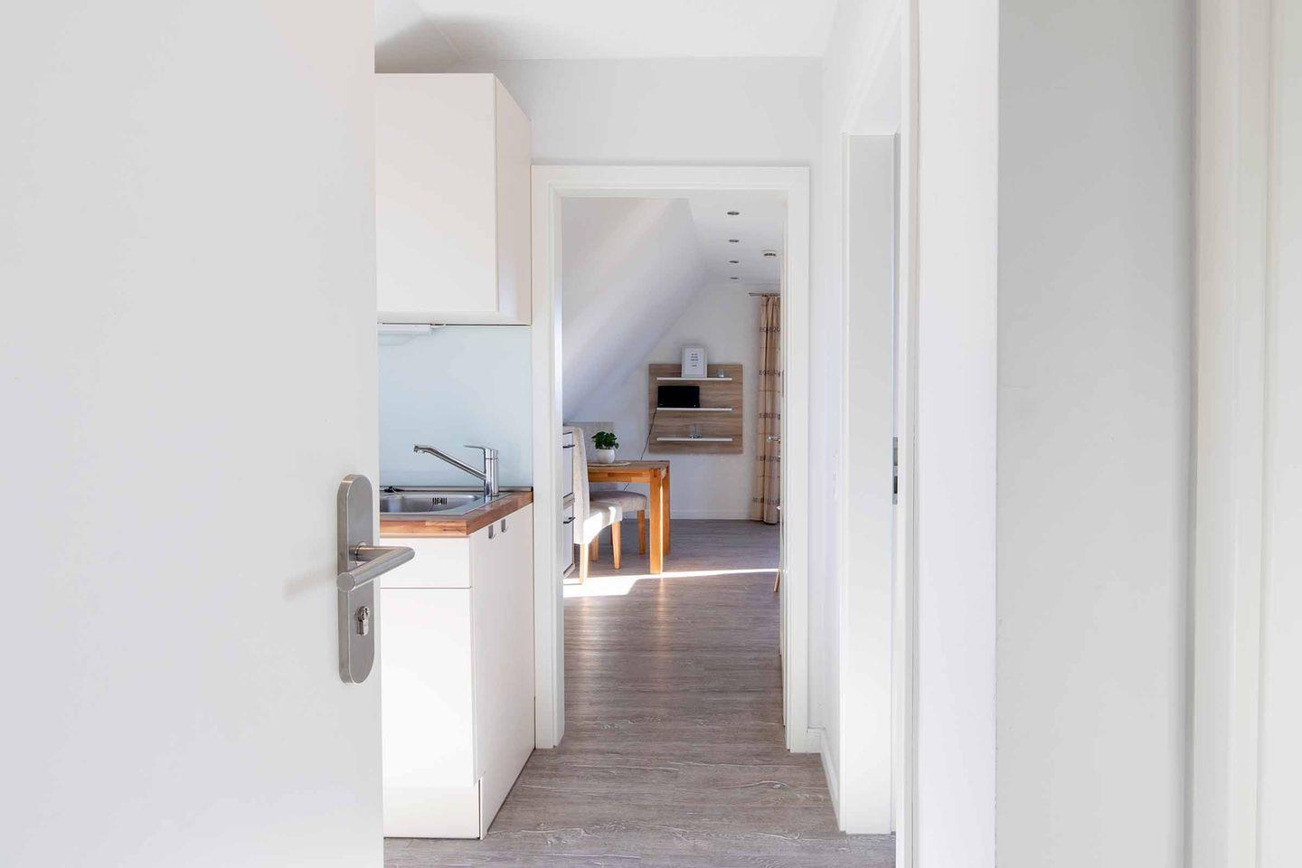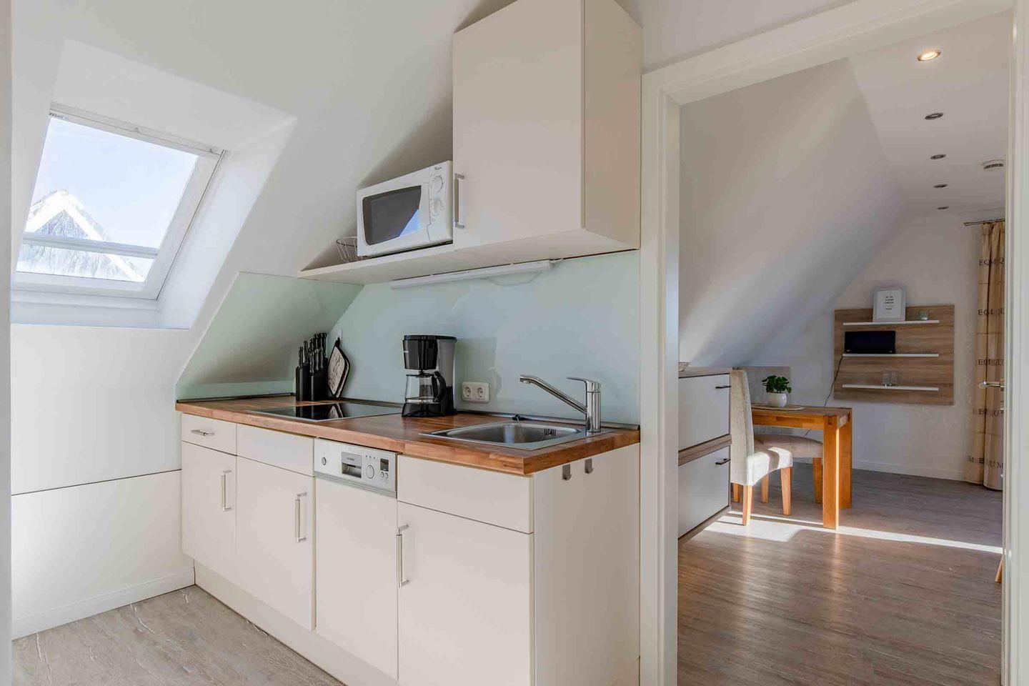 Die Ferienwohnung 7 (33 qm) liegt im Dachgeschoss und verfügt über einen Balkon (zum Parkplatz gelegen). Es gibt leider keinen Aufzug im Haus.