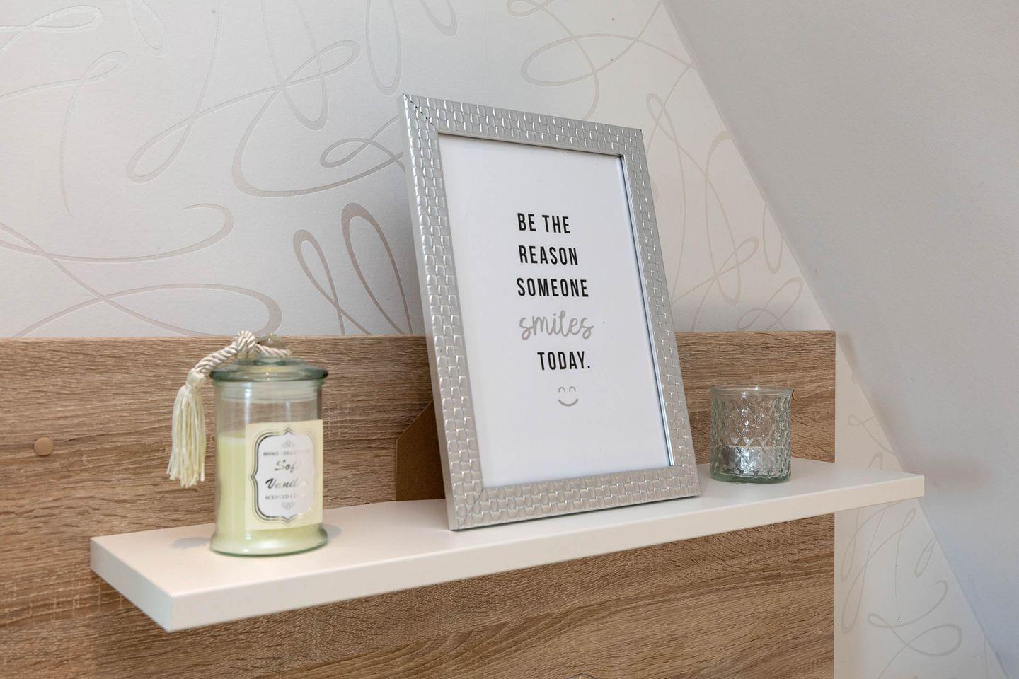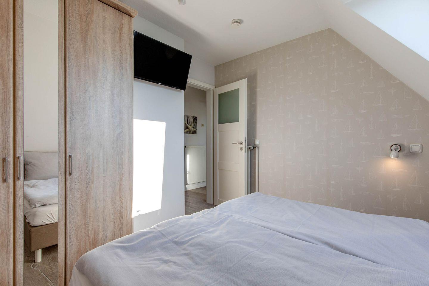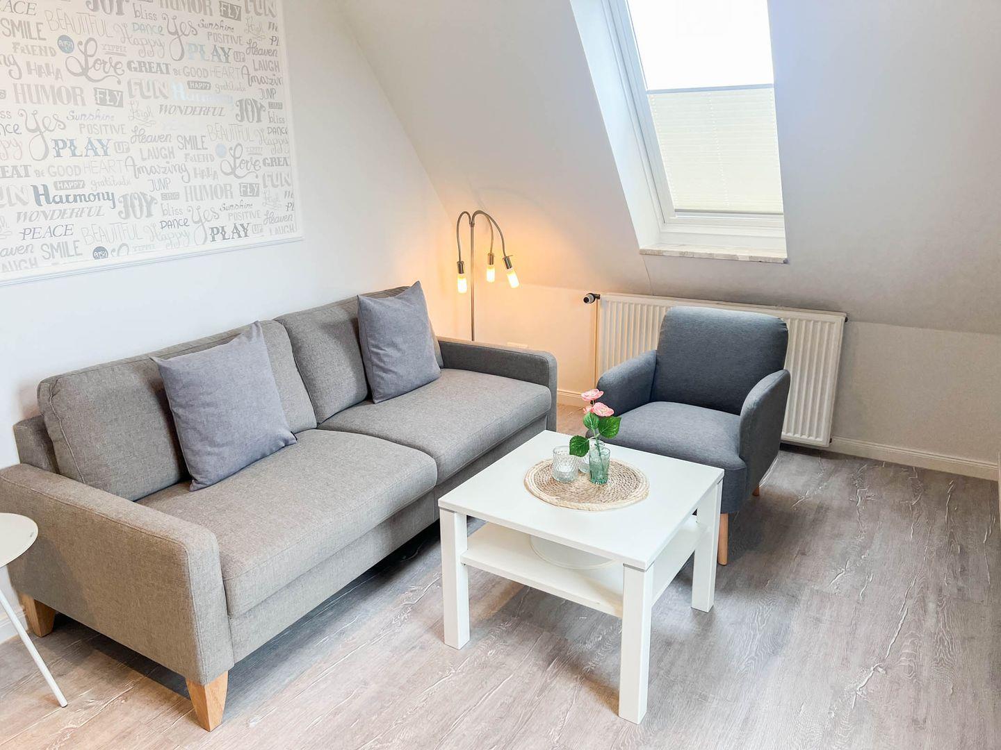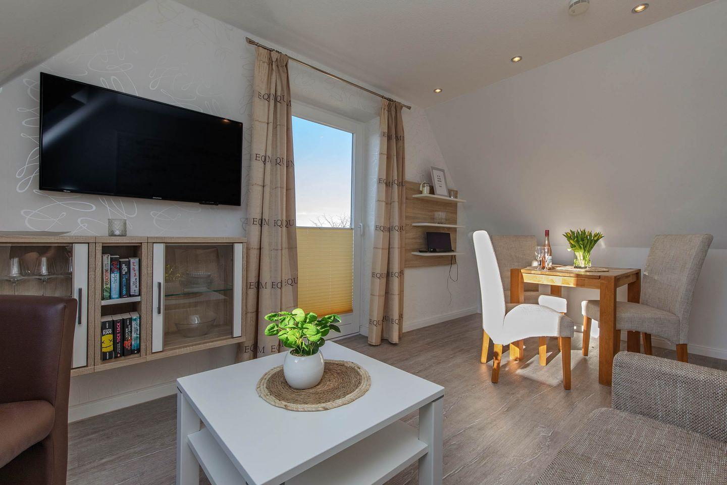 Die Ferienwohnung 8 (33 qm) liegt im Dachgeschoss und verfügt über einen Balkon (zur Straße Föhrer Weg). Es gibt leider keinen Aufzug im Haus.
