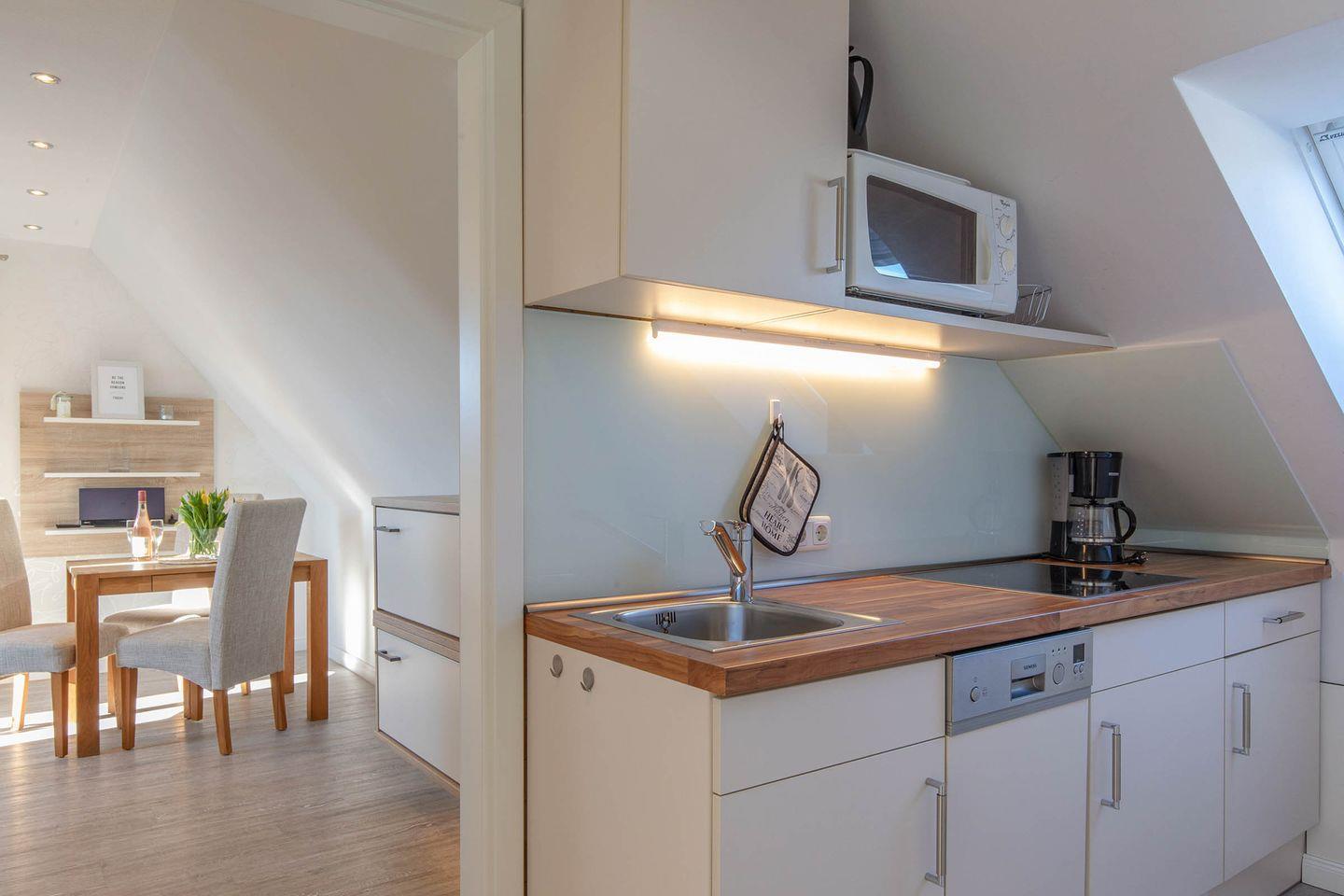 Küchenzeile: Geschirrspüler, Kochfeld, Mikrowelle, Kühlschrank mit Gefrierfunktion, Heißwasserkocher, Kaffeemaschine, Toaster.