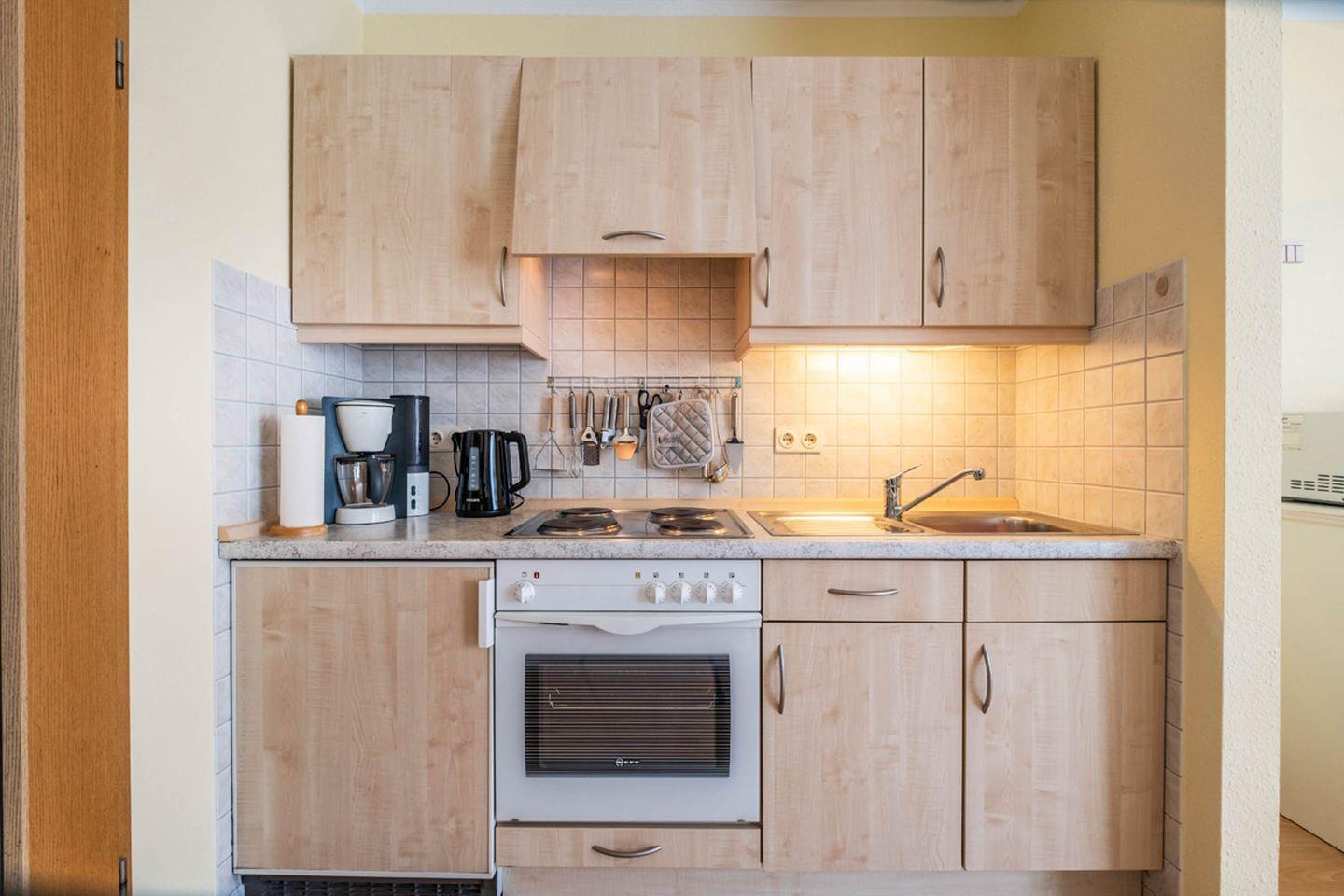 Küchenzeile: Kochfeld, Backofen, Mikrowelle, Kühlschrank mit Gefrierfunktion, Heißwasserkocher, Kaffeemaschine, Toaster.