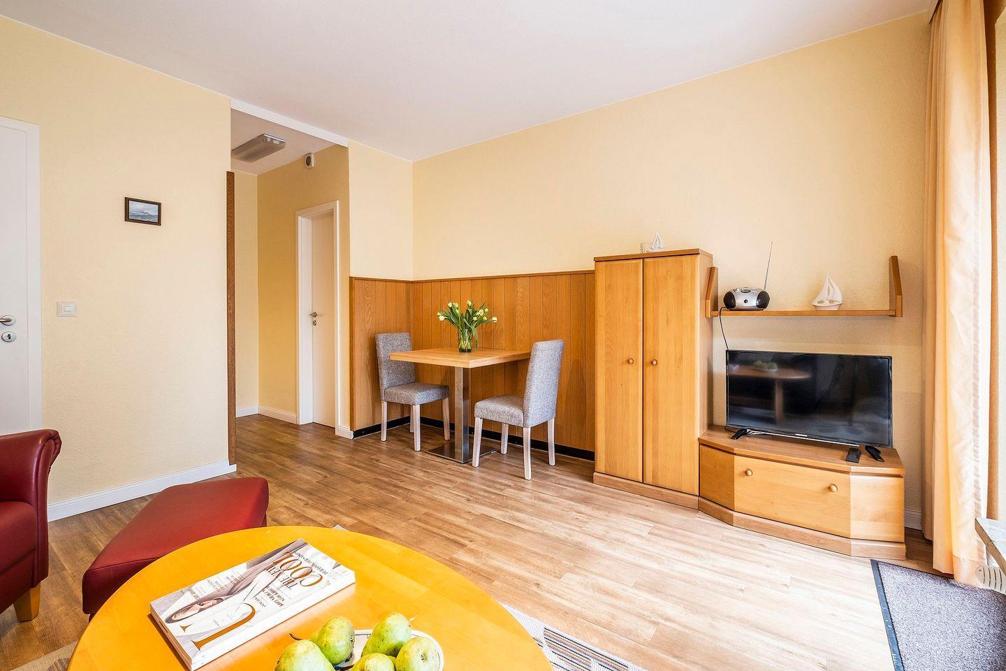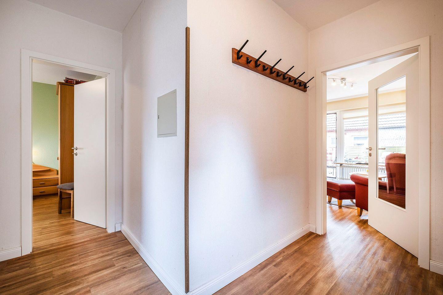 1 Wohnzimmer mit Essbereich, eine kleine Küche,1 Schlafzimmer, 1 Duschbad und ein Gäste-WC.