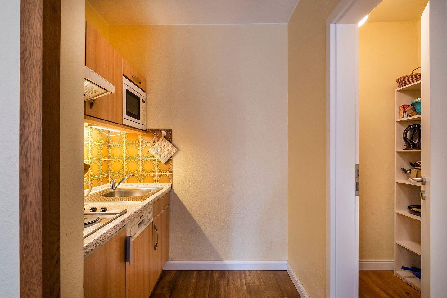 Küchenzeile: Geschirrspüler, Kochfeld, Mikrowelle, Kühlschrank mit Gefrierfunktion, Heißwasserkocher, Kaffeemaschine, Toaster.