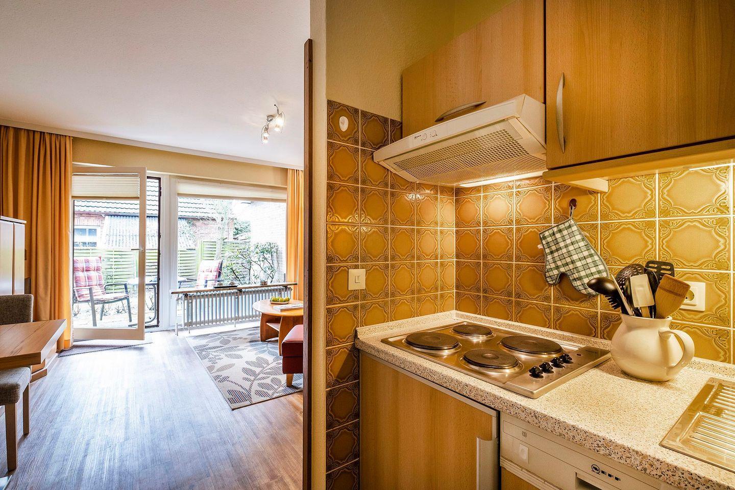 Haus Am Anker Wohnung 3 in Büsum bietet auf 47 m² eine komfortable Unterkunft im Parterre mit offener Küche, Terrasse mit Gartenblick und kostenfreiem WLAN. die Wohnung verfügt über ein Schlafzimmer, einem separaten Gäste-WC, Vinylboden, Spülmaschine sowie einem Privatparkplatz. Einkaufsmöglichkeiten, Strand und Restaurants sind jeweils 250 m entfernt.