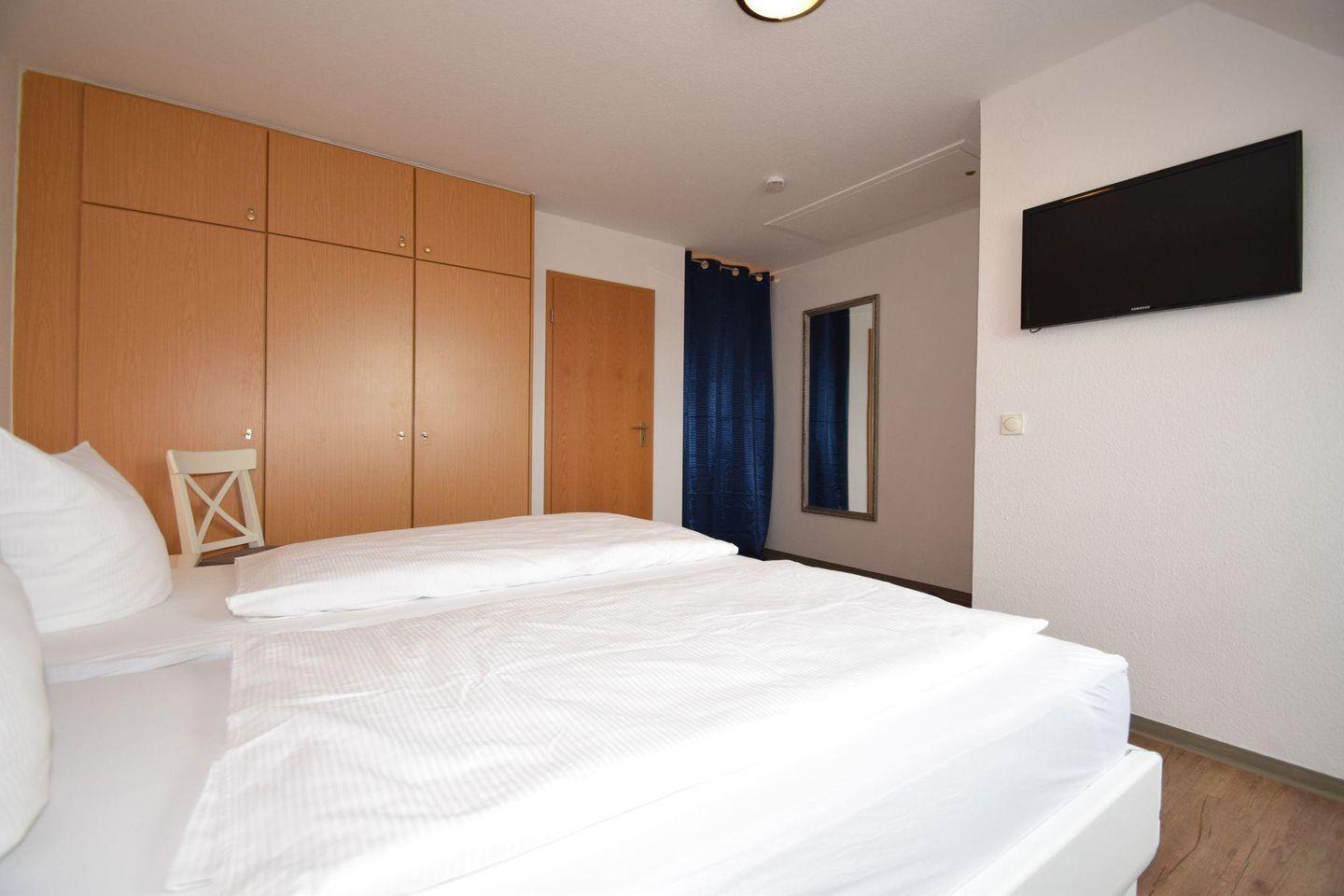 Im oberen Bereich der Wohnung (über eine Treppe zu erreichen) befindet sich 1 Schlafzimmer mit einem Ehebett sowie 1 Gäste-WC.