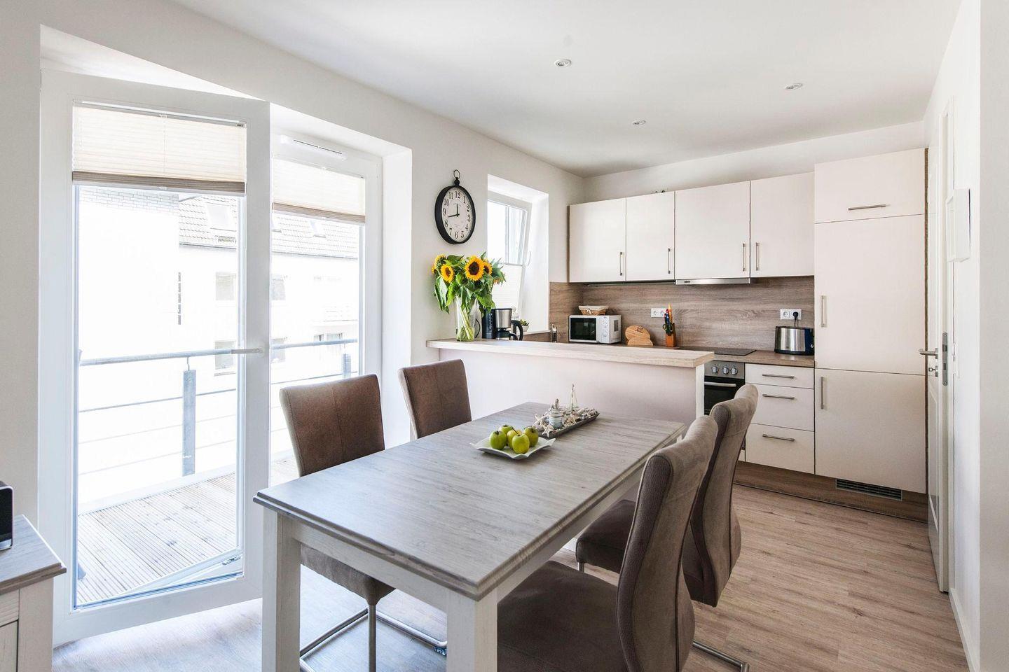 Die Ferienwohnung 2.2 ist eine lichtdurchflutete, liebevoll eingerichtete 2-Raum-Wohnung mit Balkon. Die Küchenzeile und der Essbereich sind direkt im Wohnbereich integriert. Das Bad verfügt über eine ebenerdige Dusche, WC, Handtuchtrockner und Haar-Föhn. Vom Wohnbereich gelangen Sie direkt auf den Balkon.