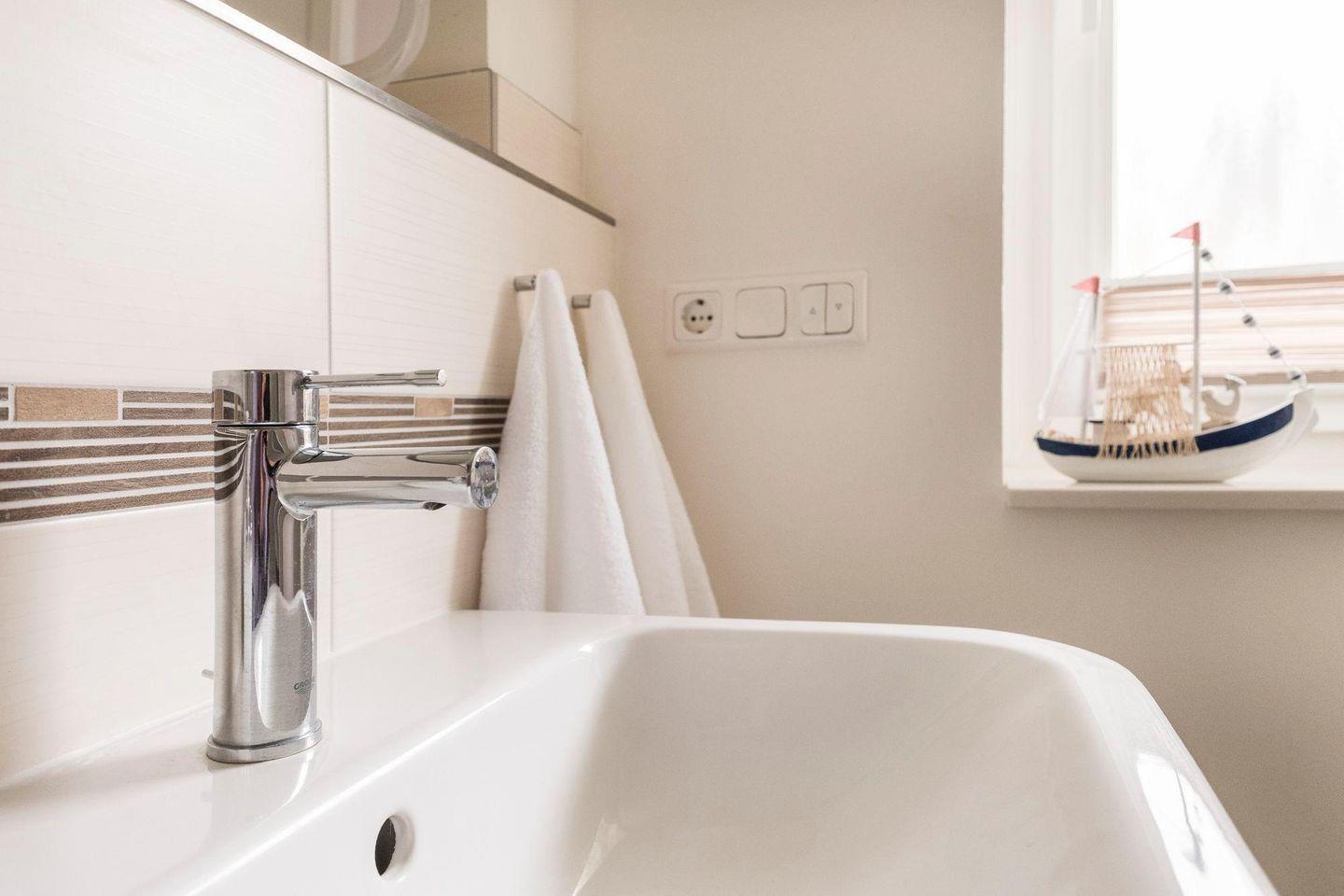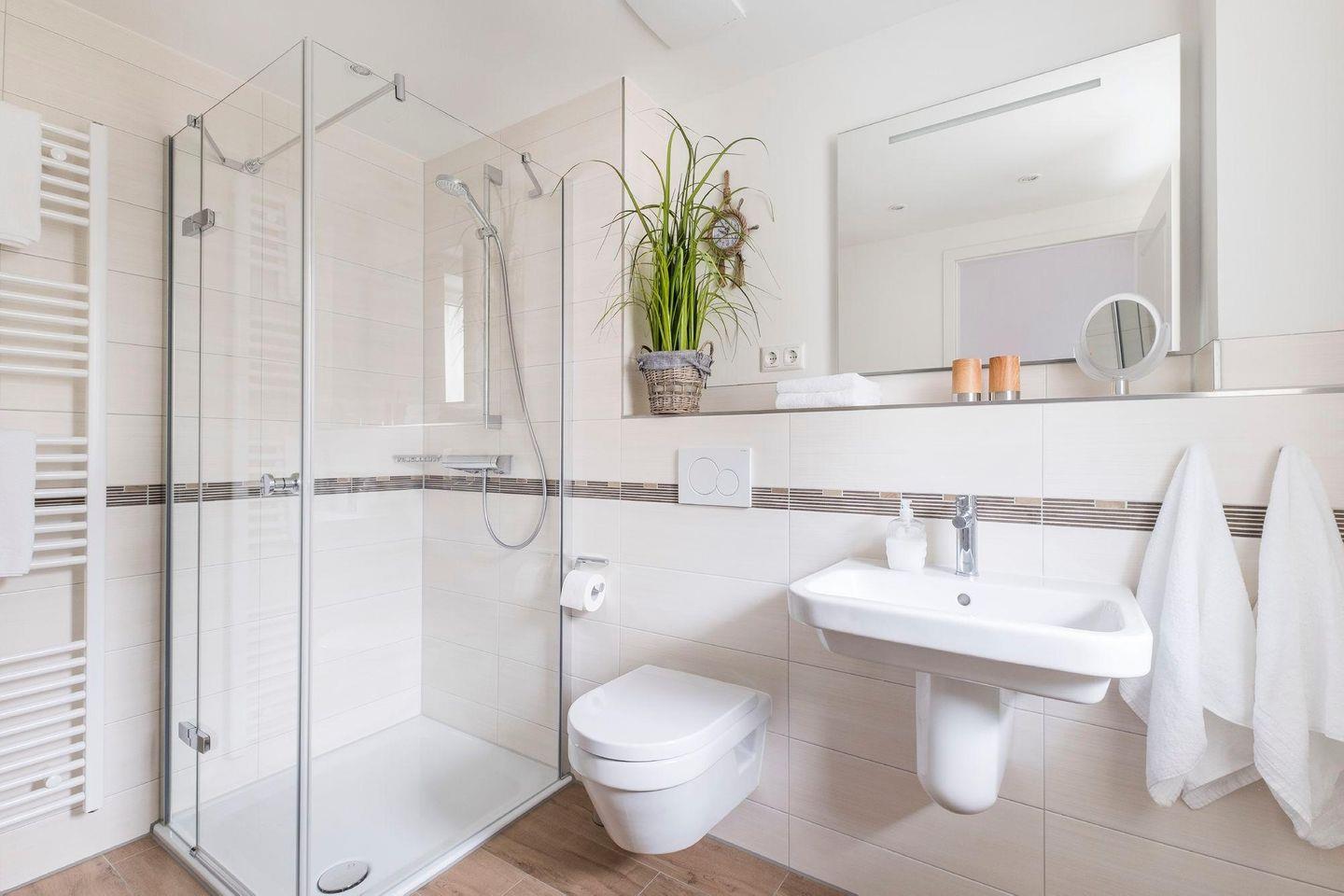 Sanitär: Duschbad mit ebenerdiger Dusche, Haar-Föhn, Kosmetikspiegel