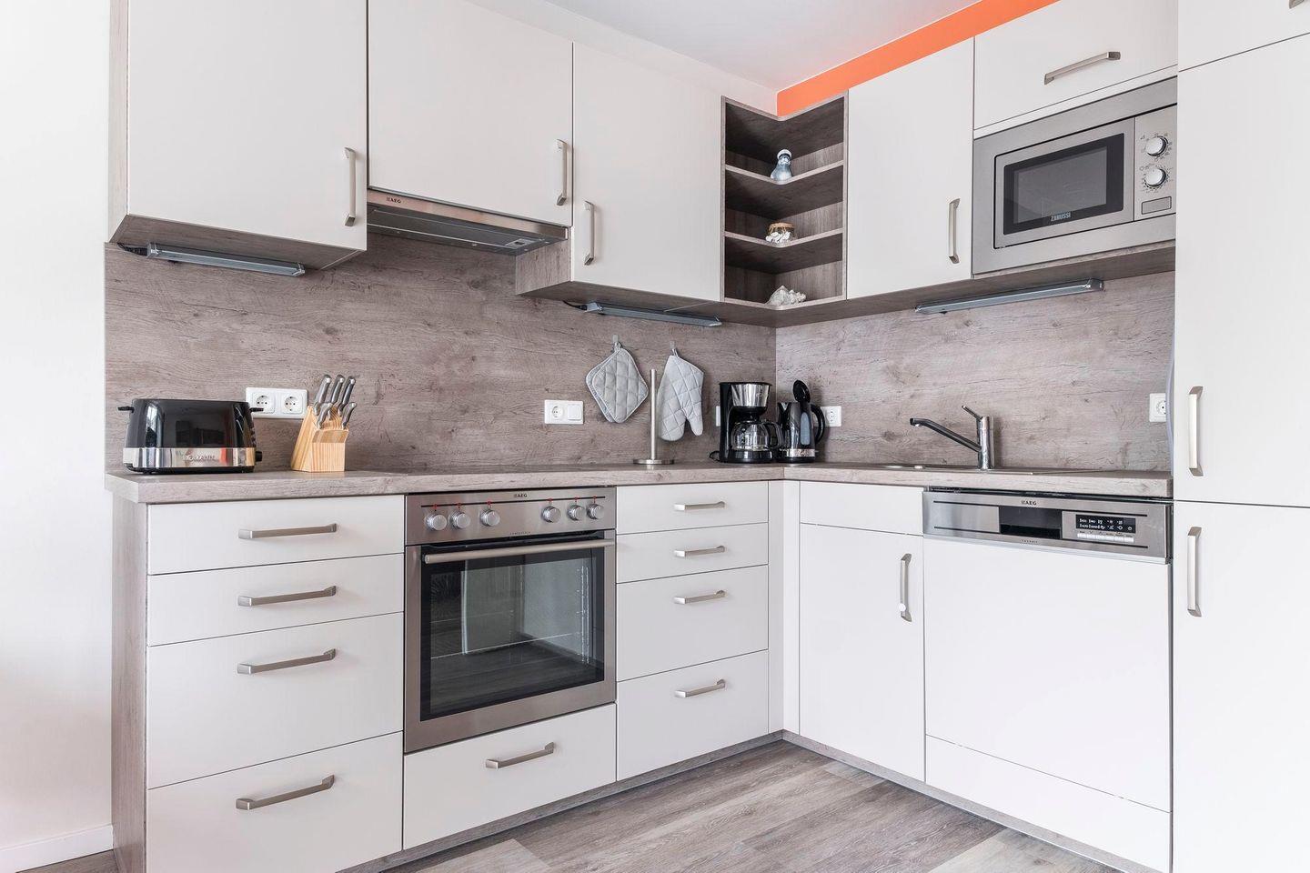 Küchenzeile: Geschirrspüler, Cerankochfeld, Mikrowelle, Backofen, Kühlschrank mit Gefrierfach.