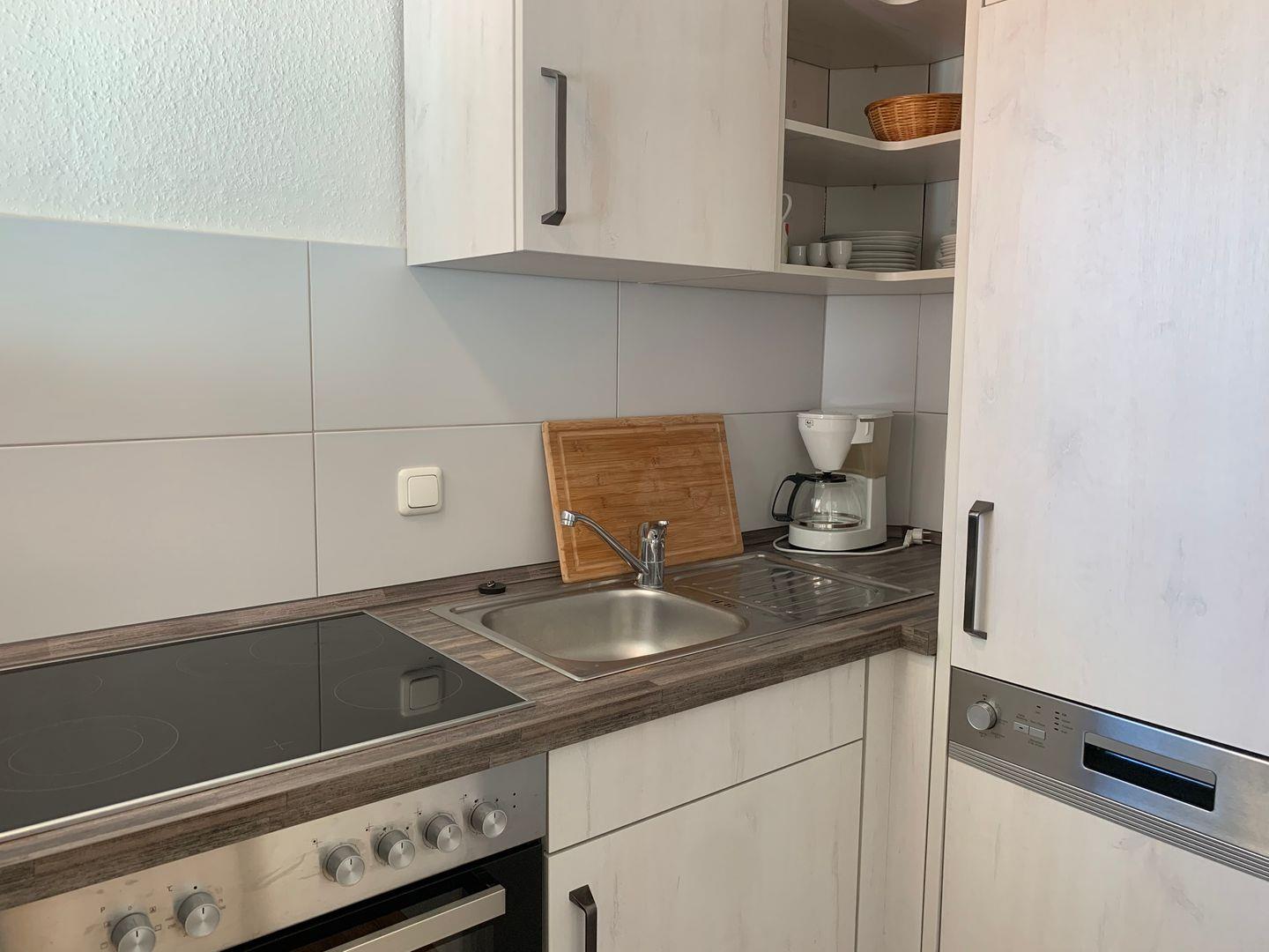 Küchenzeile: Geschirrspüler, Kochfeld, Mikrowelle, Kühlschrank mit Gefrierfunktion, Heißwasserkocher, Kaffeemaschine, Toaster.